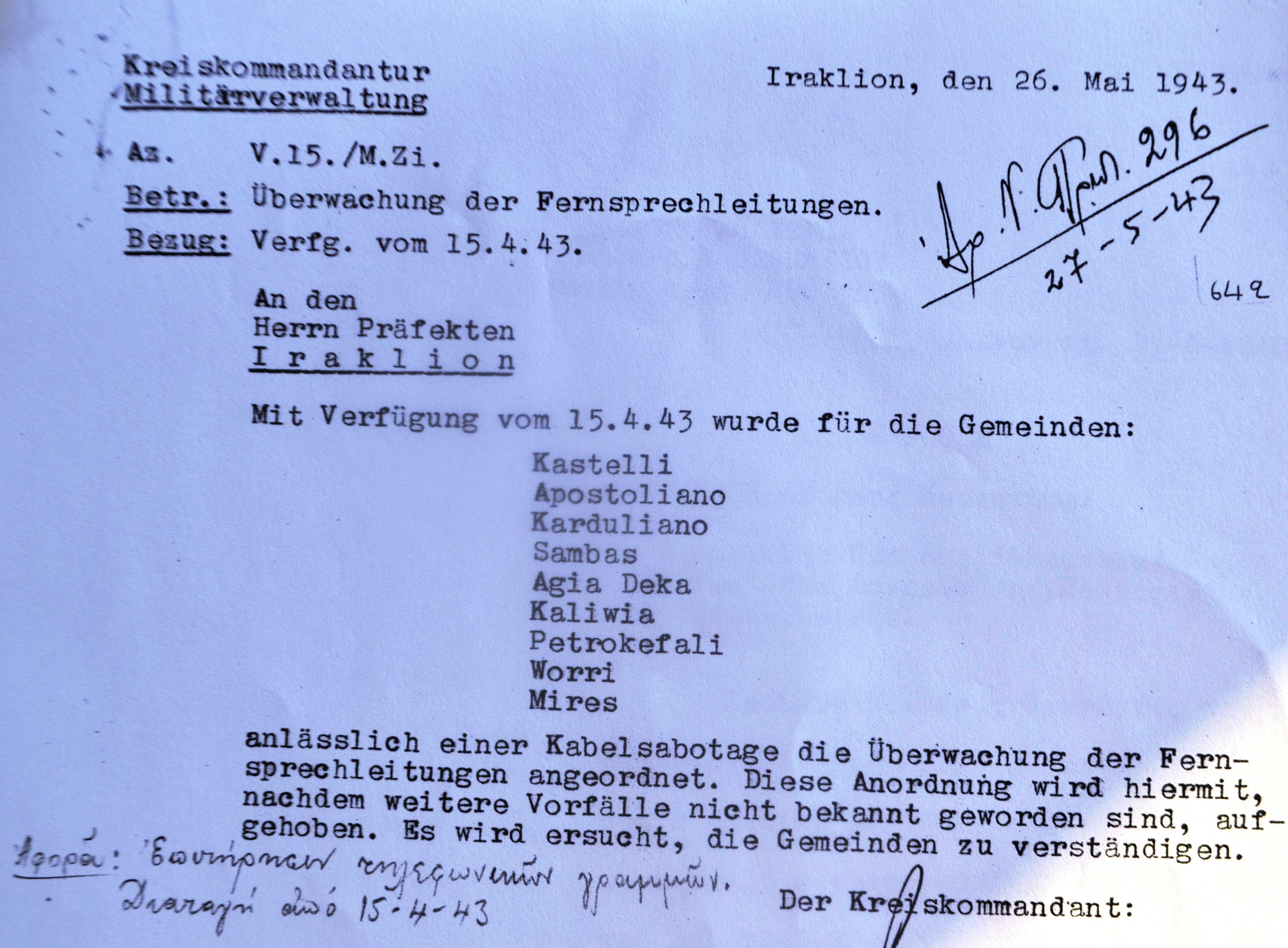 «…δια διαταγής από 15-4-43 επεβλήθησαν εις τας Κοινότητας Καστελλίου, Αποστόλων, Καρδουλιανού, Σαμπά, Αγίων Δέκα, Καλυβιών, Πετροκεφάλι, Βόρρων και Μοιρών, λόγω διαπραχθέντος Σαμποτάζ δι’αποκοπής τηλεφ. Συρμάτων, η φύλαξις των συρμάτων τούτων. Η διαταγή αύτη αίρεται δια της παρούσης,, καθ’όσον εν τω μεταξύ δεν εγένοντο άλλα αδικήματα. Παρακαλείσθε να ειδοποιήσετε σχετικώς τας κοινότητας.