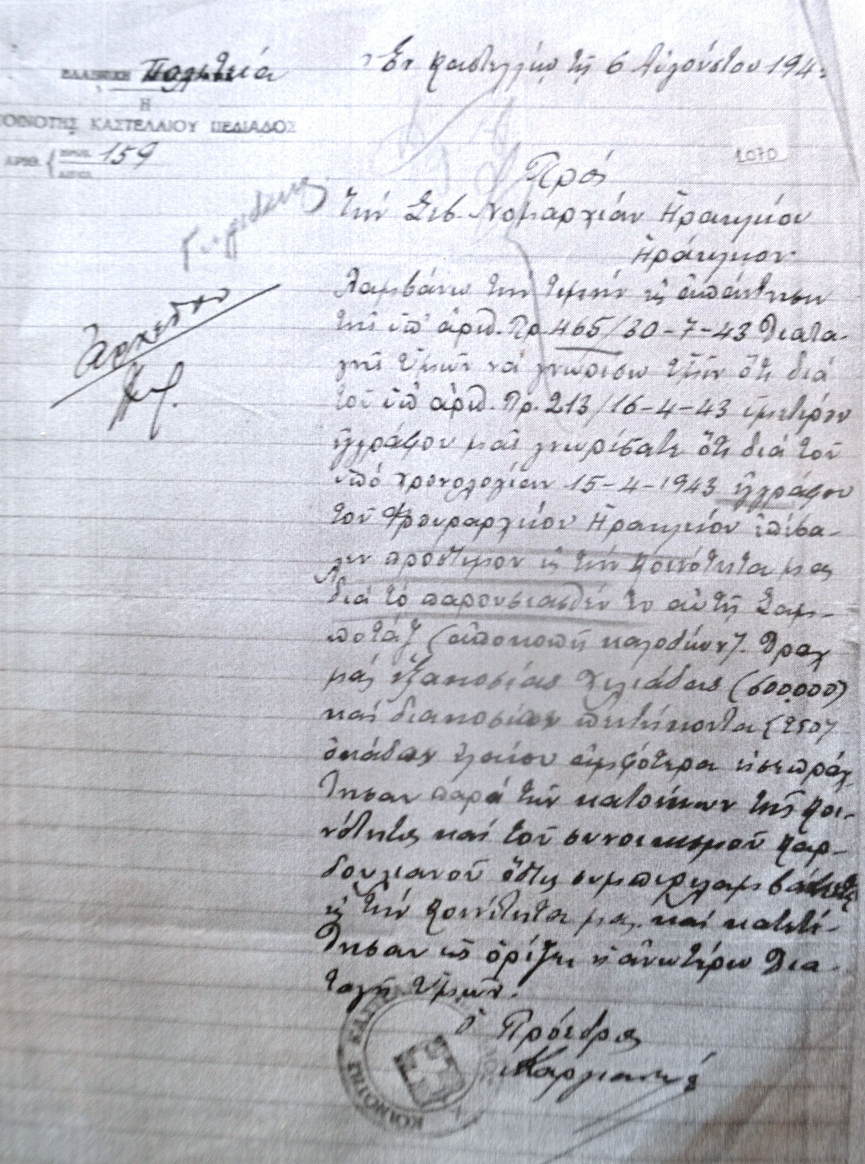 Λαμβάνω την τιμήν εις απάντησιν της υπ. αριθ. πρ. 465/30-7-43 Διαταγής Υμών να γνωρίσω Υμίν ότι δια του υπ. αριθ. πρ. 213/16-4-43 υμετέρου εγγράφου μας γνωρίσατε ότι δια του υπό χρονολογίαν 15-4-1943 εγγράφου του Φρουραρχείου Ηρακλείου επέβαλεν πρόστιμον εις την Κοινότητά μας δια το παρουσιασθέν εν αυτή σαμποτάζ (αποκοπή καλωδίων) δραχμάς εξακοσίας χιλιάδας (600.000) και διακοσίων πεντήκοντα (250) οκάδων ελαίου αμφότερα εισεπράχθησαν παρά των κατοίκων της Κοινότητος και του συνοικισμού Καρδουλιανού όστις συμπεριλαμβάνεται εις την Κοινότητά μας και κατετέθησαν ως ορίζει η ανωτέρω διαταγή υμών.