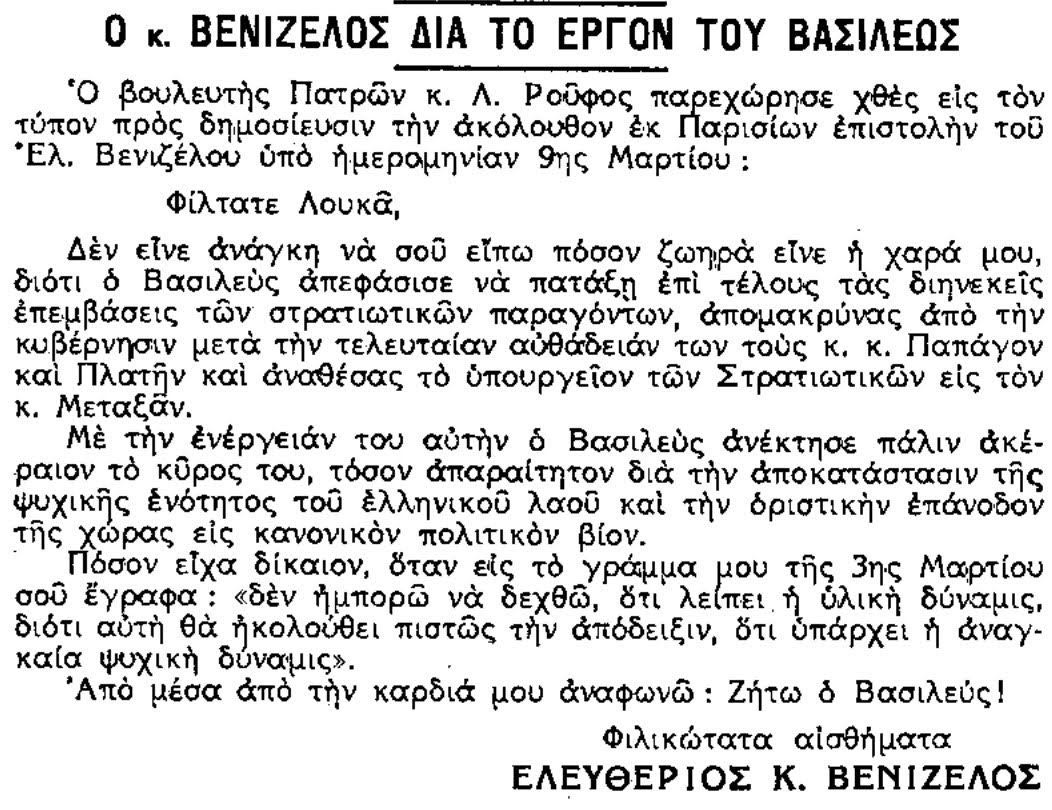 To «ΕΛΕΥΘΕΡΟΝ ΒΗΜΑ» της ίδιας ημέρας δημοσιεύει την τελευταία επιστολή του Βενιζέλου: