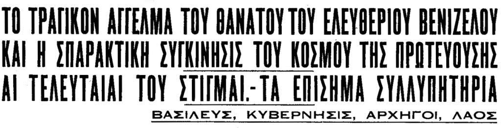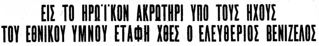 «Ο Βενιζέλος νεκρός; Πράγματα ανυπόφορα, παρ’ όλην την φυσικότητά των, διά τον σημερινόν Έλληνα, τον φίλον του Βενιζέλου ή τον εχθρόν. Όλοι εχθροί και φίλοι επί ένα τέταρτον και πλεόν αιώνος εζήσαμεν υπό το έντονο φως της θριαμβευτικής διανοίας του.