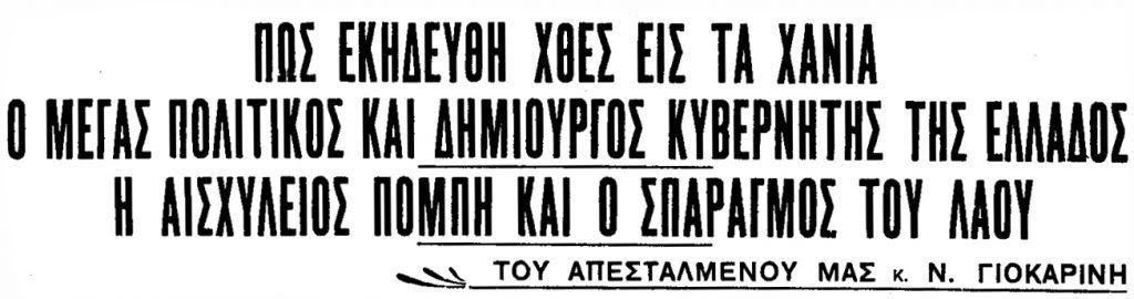 «ΧΑΝΙΑ, 27 Μαρτίου. Την 7.30’ πρωινήν ο “Κουντουριώτης” εισέπλευσεν εις τον λιμένα των Χανίων, ακολουθούμενος από τα “Ψαρά”. Μετά τινα λεπτά, κατέπλευσεν επίσης το αντιτορπιλλικόν “Σπέτσαι”, φέρον τον Διάδοχον και την κυβέρνητικήν αντιπροσωπείαν (…) Ηκολούθησαν πέντε επιβατικά, πλήρη κόσμου, ερχομένου εξ Αθηνών διά να προσκυνήση την σορόν του Ελευθερίου Βενιζέλου.