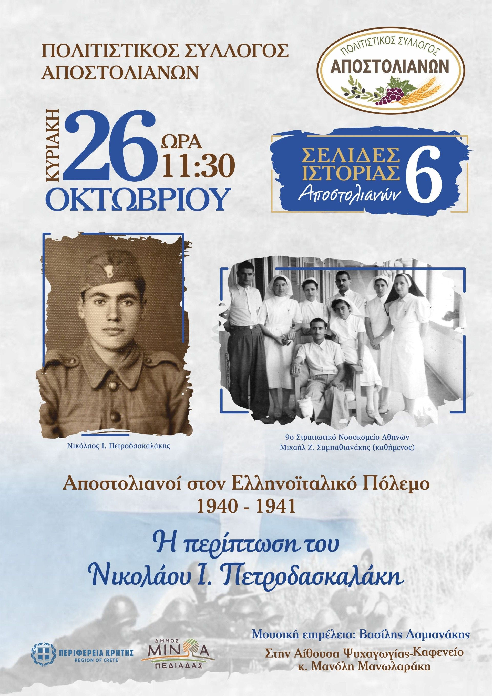 Ο Πολιτιστικός Σύλλογος Αποστολιανών διοργάνωση την προηγούμενη Κυριακή 26 Οκτωβρίου συγκινητική εκδήλωση αφιέρωμα στον πόλεμο του’40, με σκοπό οι νεώτερες γενιές να γνωρίσουν τον αγώνα των Ελλήνων απέναντι στον Ιταλικό φασισμό και τη συμμετοχή των 71 Αποστολιανών.