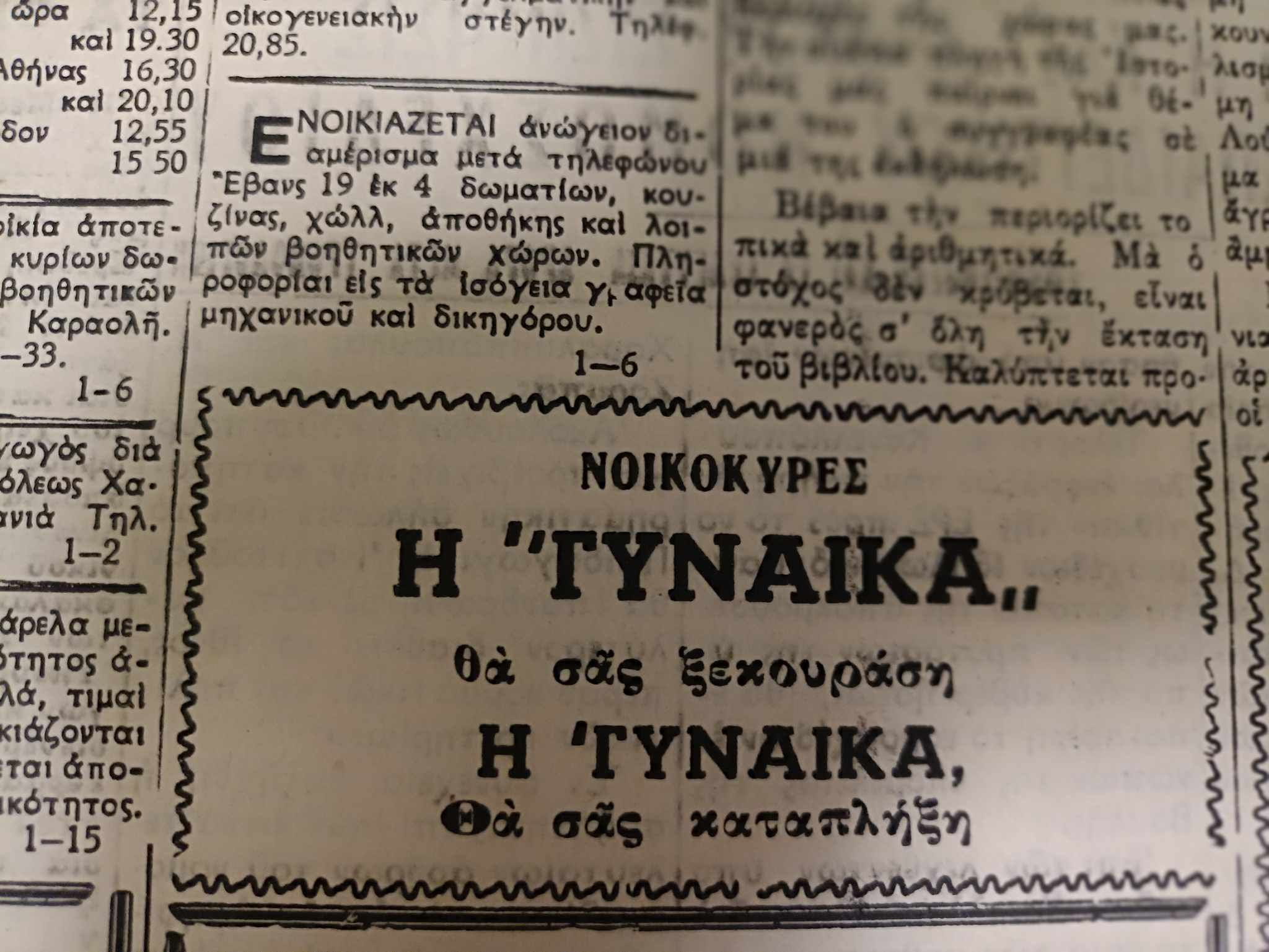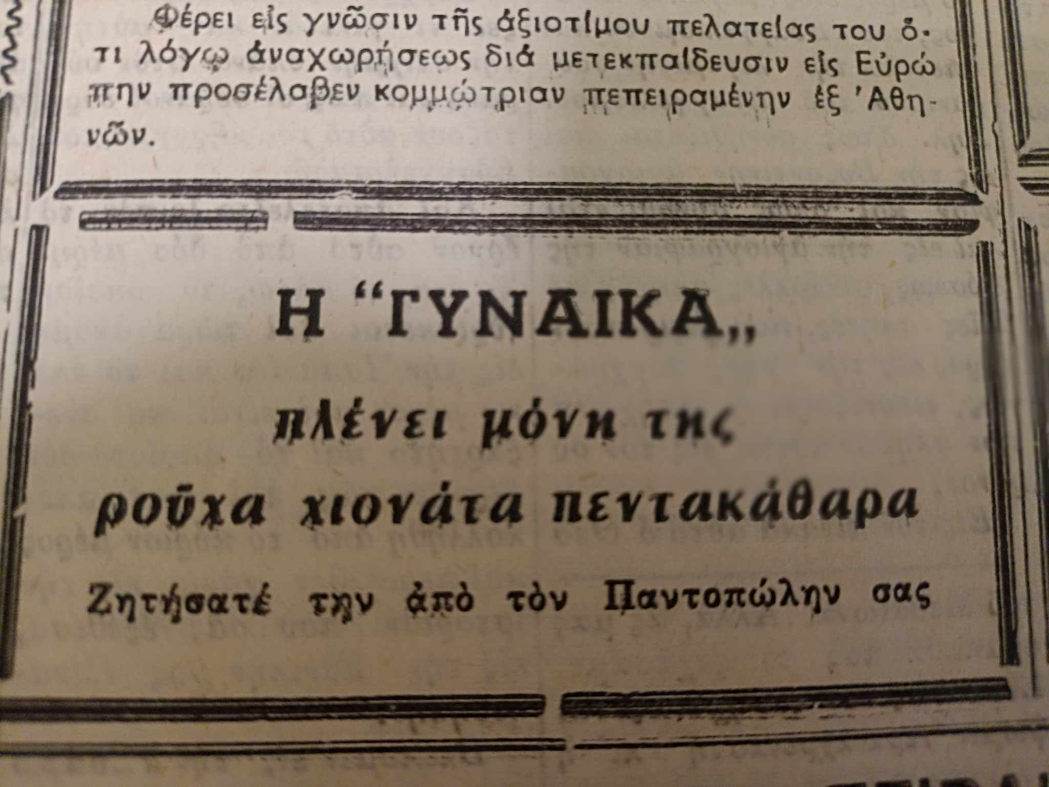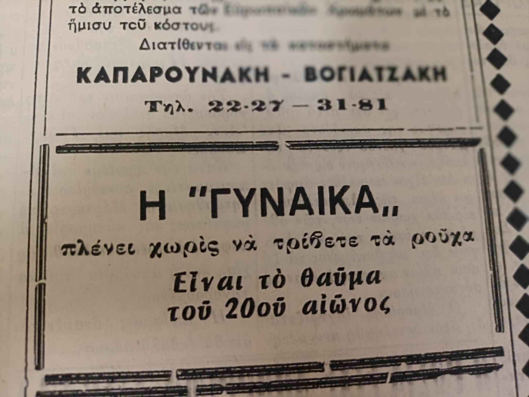 Και ποια ήταν η γυναίκα; Ήταν η λευκαντική σαπουνόσκονη, που όπως ανέφερε η διαφήμιση που δημοσιευόταν στις εσωτερικές σελίδες της εφημερίδας, «πλένει μόνη της χωρίς να τρίψετε τα ρούχα γίνονται πεντακάθαρα» ενώ δεν παρέλειπε να αναφέρει ότι ήταν τελείως αβλαβής.