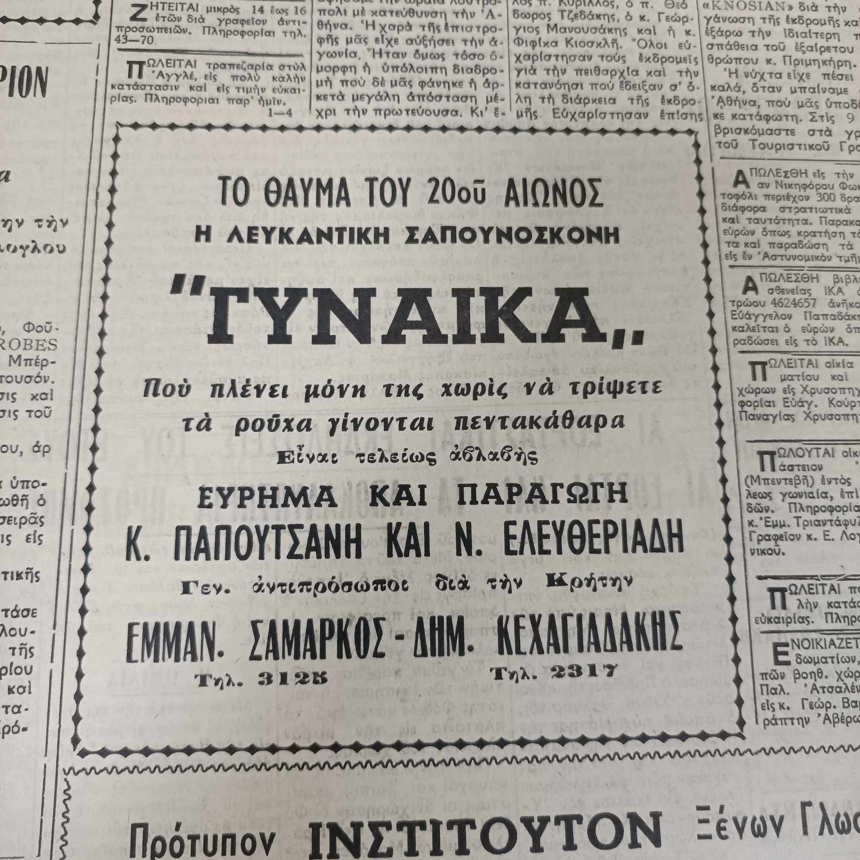 Την λευκαντική σαπουνόσκονη όπως ανέφερε η διαφήμιση εφηύραν και παρήγαγαν οι Κ.Παπουτσάνης και Ν.Ελευθεριάδης ενώ αντιπρόσωποι για την Κρήτη ήταν οι Εμμαν. Σαμάρκος κα Δημ.Κεχαγιάς.