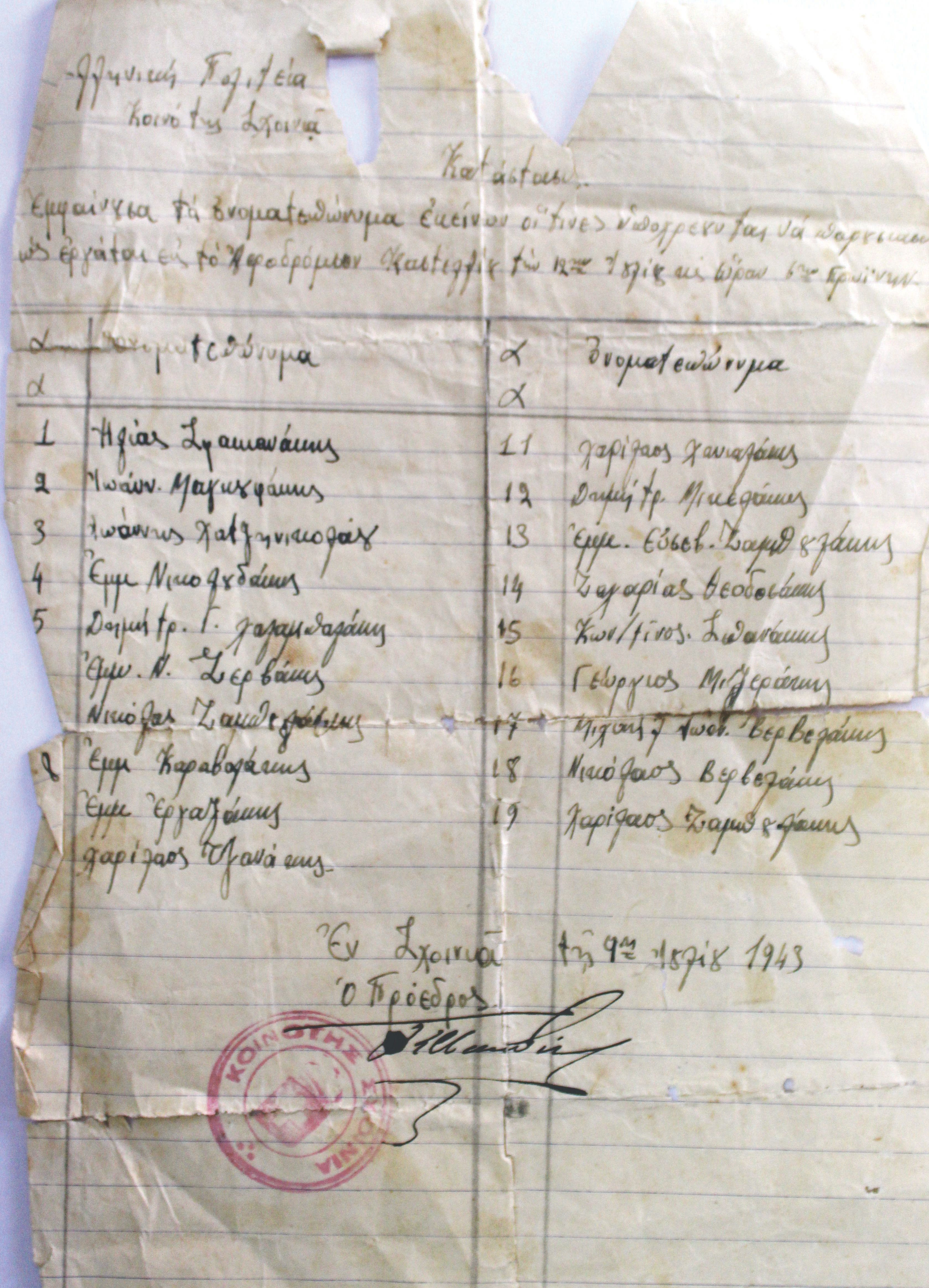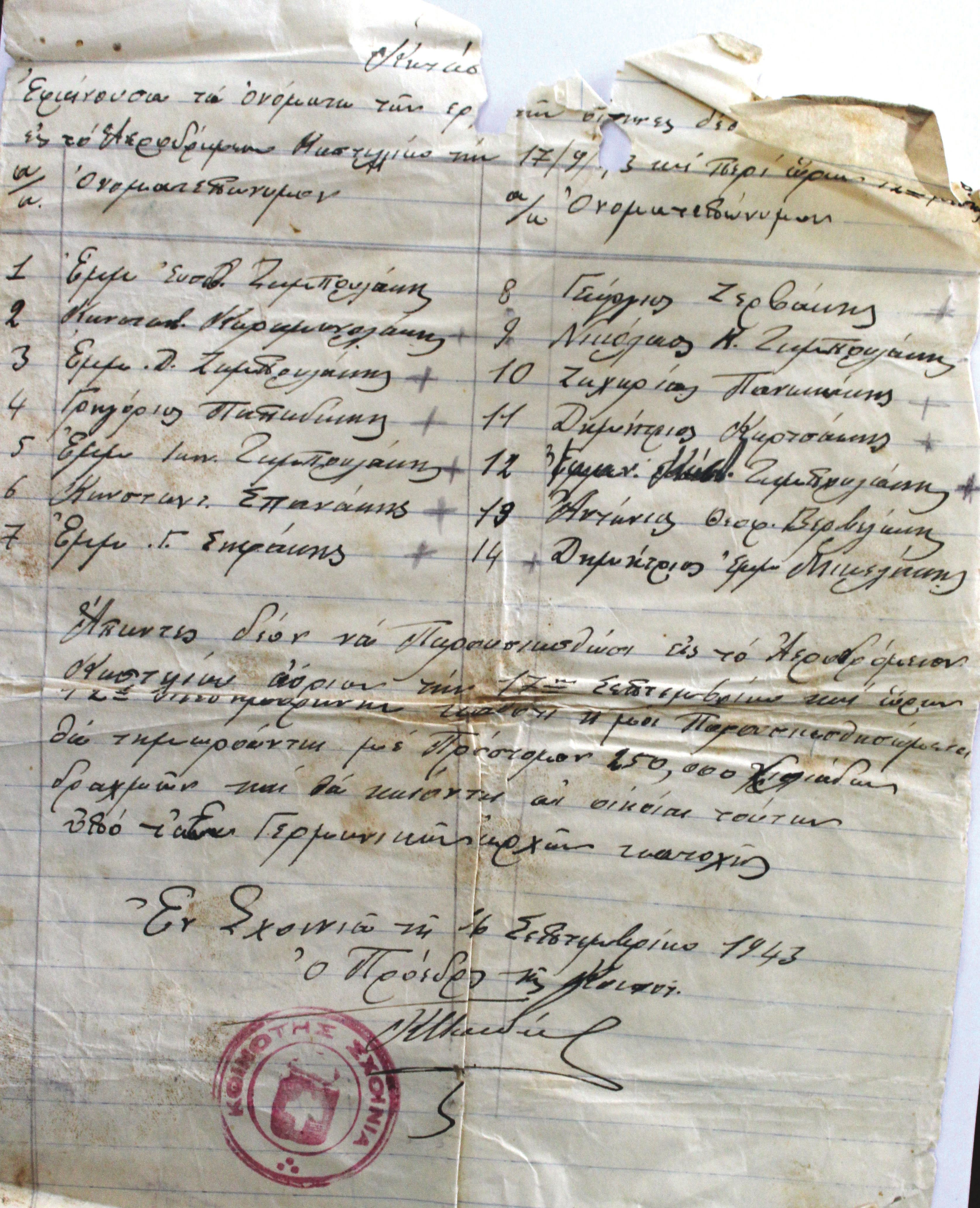 «…η μοι παρουσιασθησώμενοι θα τιμωρούνται με πρόστιμον 250.000 δραχμών και θα καίονται αι οικίαι τούτων υπό των Γερμανικών αρχών κατοχής…”.
