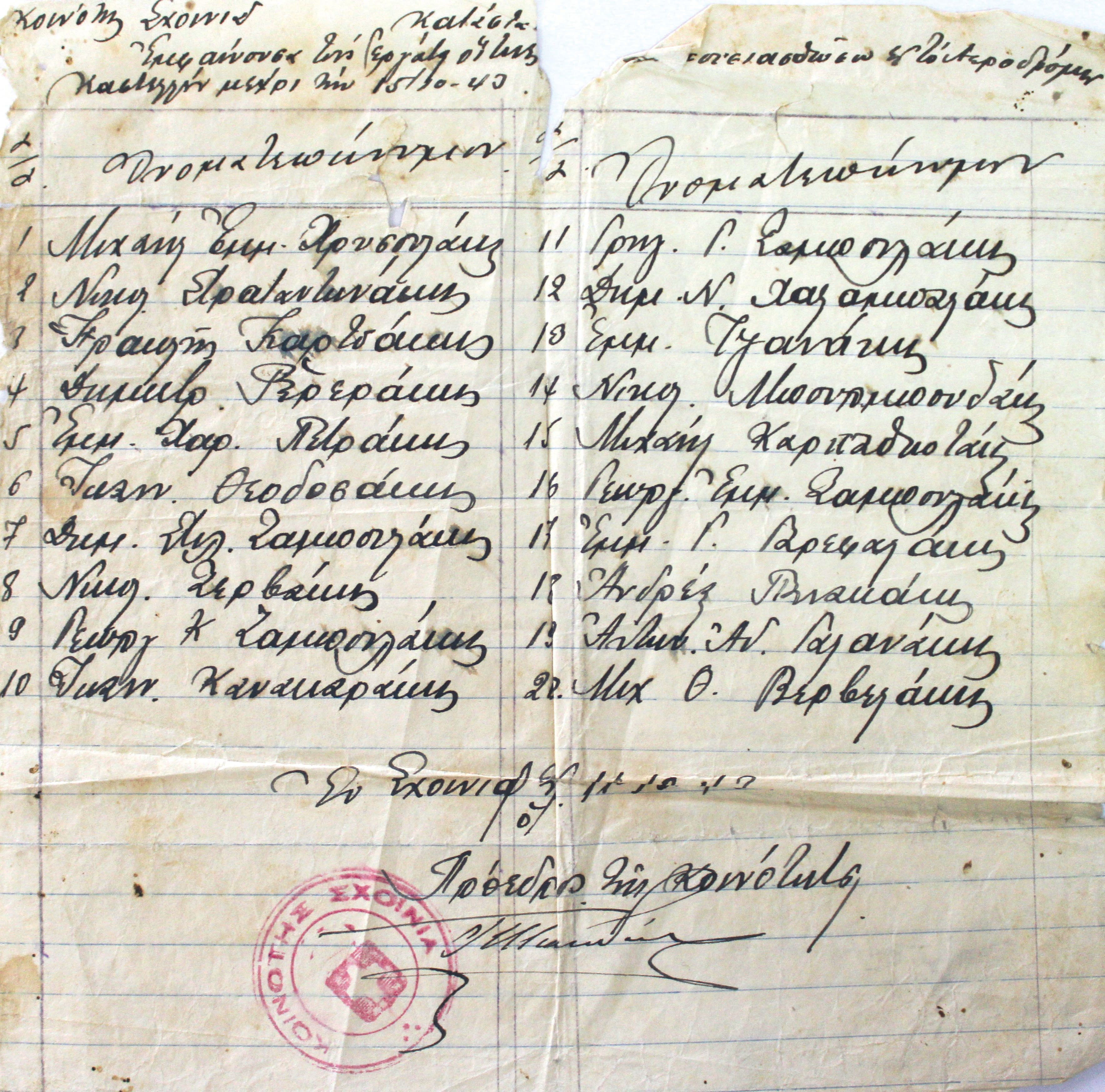 Στο έγγραφο – κατάσταση των εργατών του Σκινιά με ημερομηνία 16 Σεπτεμβρίου 1943, διαβάζουμε: