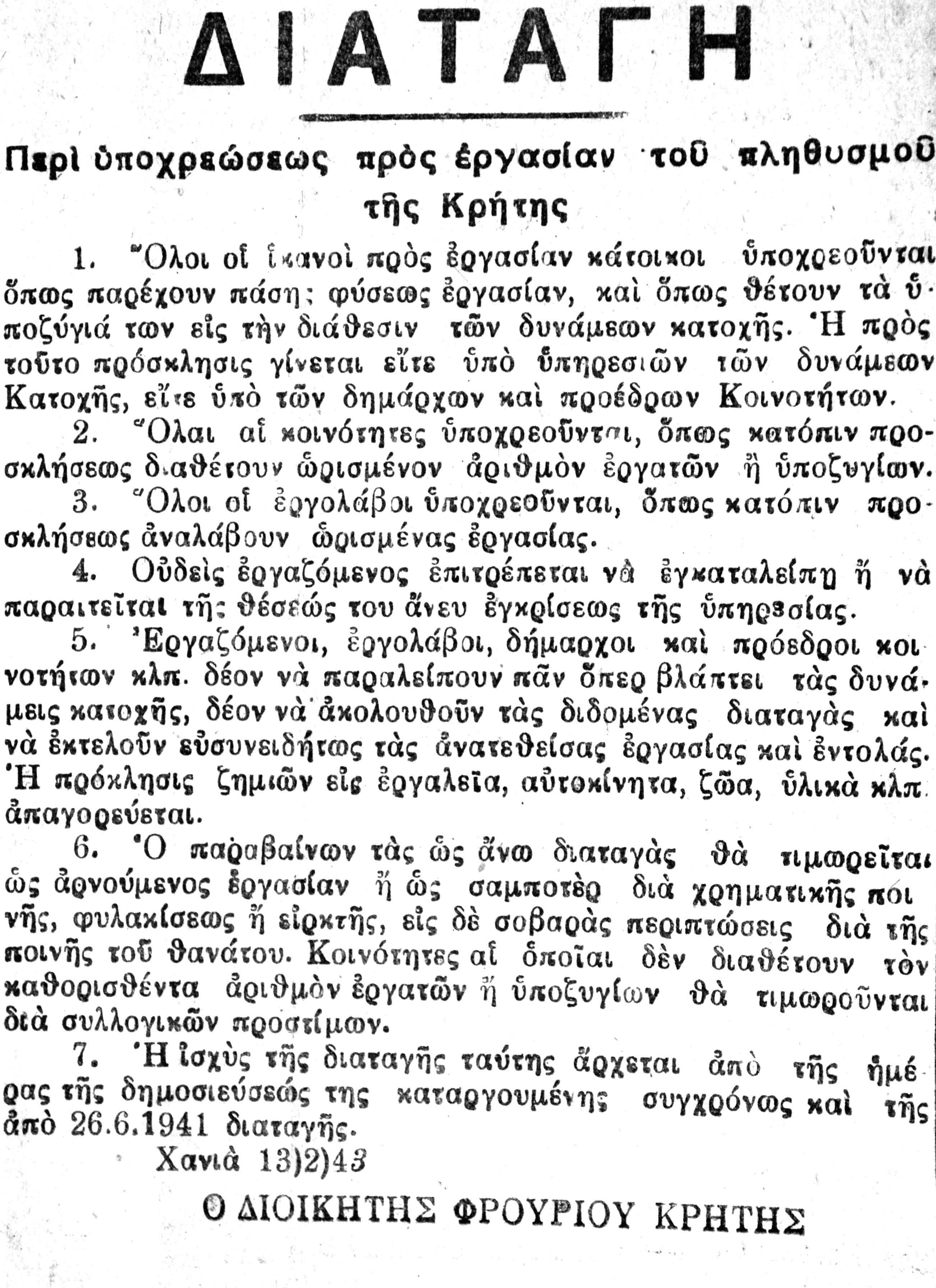 1ον). Σύμπας ο αστικός πληθυσμός της Κρήτης, αδιακρίτως επαγγέλματος, ηλικίας, φύλου, υποχρεούται προς παροχήν εργασίας, εφ’όσον κληθή προς τούτο υπό Γερμανικής τινός υπηρεσίας ή υπό του Δημάρχου (διαταγή του Στρατιωτικού Διοικητού Κρήτης της 20/6/41 περί εισαγωγής εις Κρήτην της υποχρεώσεως προς εργασίαν).