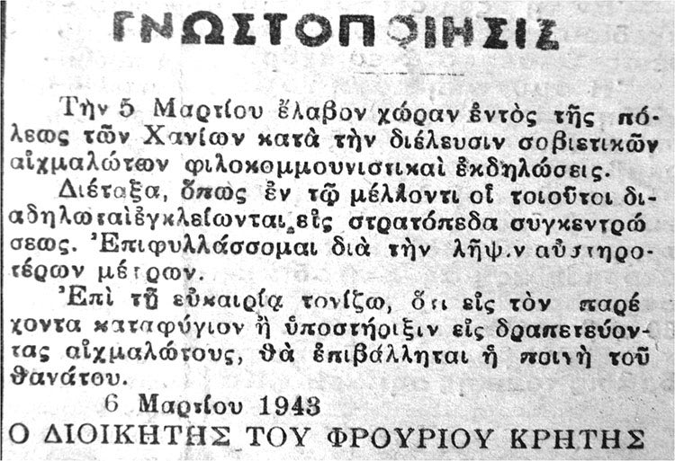 Την 5ην Μαρτίου έλαβον χώραν εντός της πόλεως των Χανίων κατά τη διέλευσιν σοβιετικών αιχμαλώτων φιλοκομμουνιστικαί εκδηλώσεις. Διέταξα, όπως εν τω μέλλοντι οι τοιούτοι διαδηλωταί εγκλείωνται εις στρατόπεδα συγκεντρώσεως. Επιφυλάσσομαι δια την λήψιν αυστηροτάτων μέτρων. Επί τη ευκαιρία τονίζω, ότι εις τον παρέχοντα καταφύγιον ή υποστήριξιν εις δραπετεύοντας αιχμαλώτους, θα επιβάλληται η ποινή του θανάτου