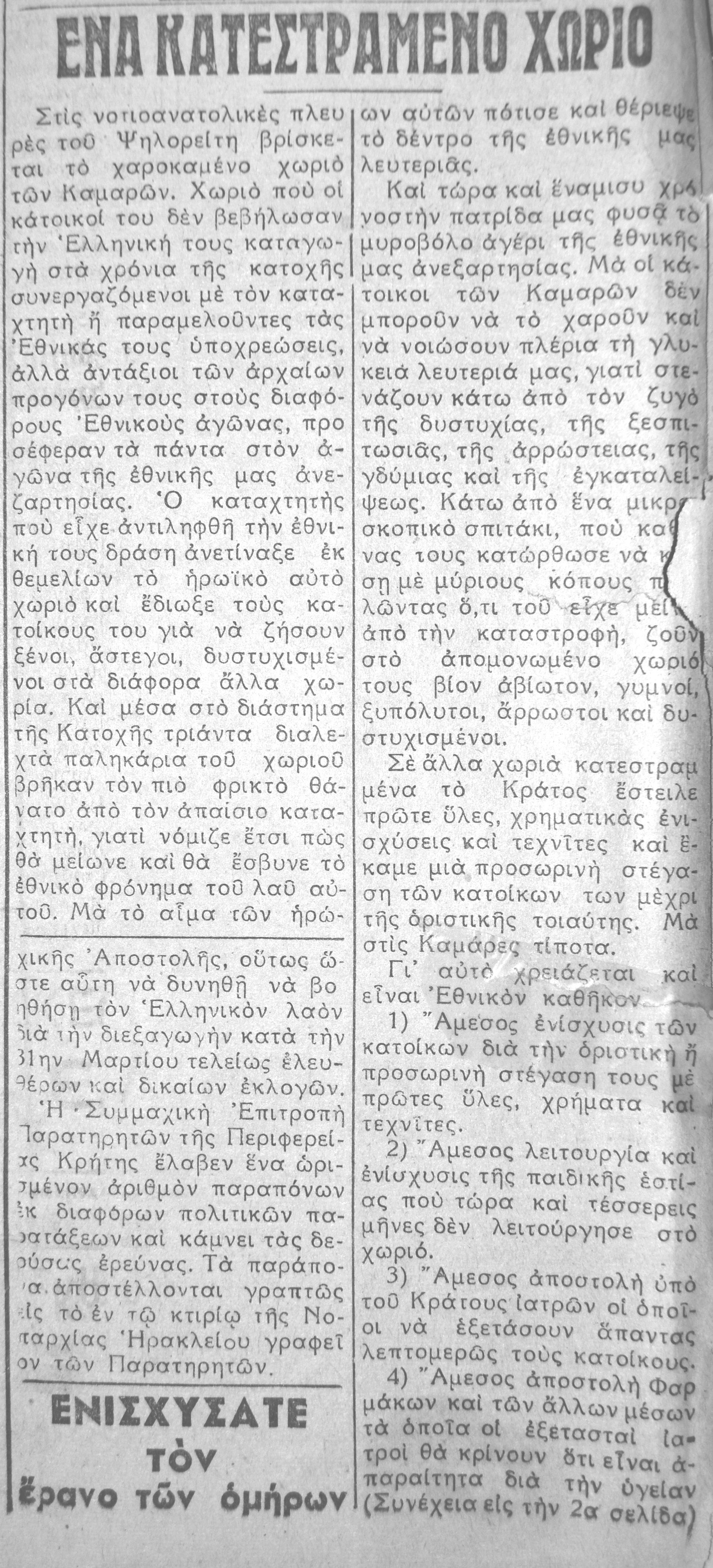 Ένα χρόνο μετά την απελευθέρωση της Κρήτης και τη νίκη των συμμαχικών δυνάμεων, στην εφημερίδα του Ηρακλείου ΕΘΝΙΚΟΣ ΚΗΡΥΞ με ημερομηνία 23 Μαρτίου 1946, συντάκτης με τα αρχικά Μ.Δ. αφιερώνει ένα άρθρο στο χωριό Καμάρες δίδοντάς του τον τίτλο: