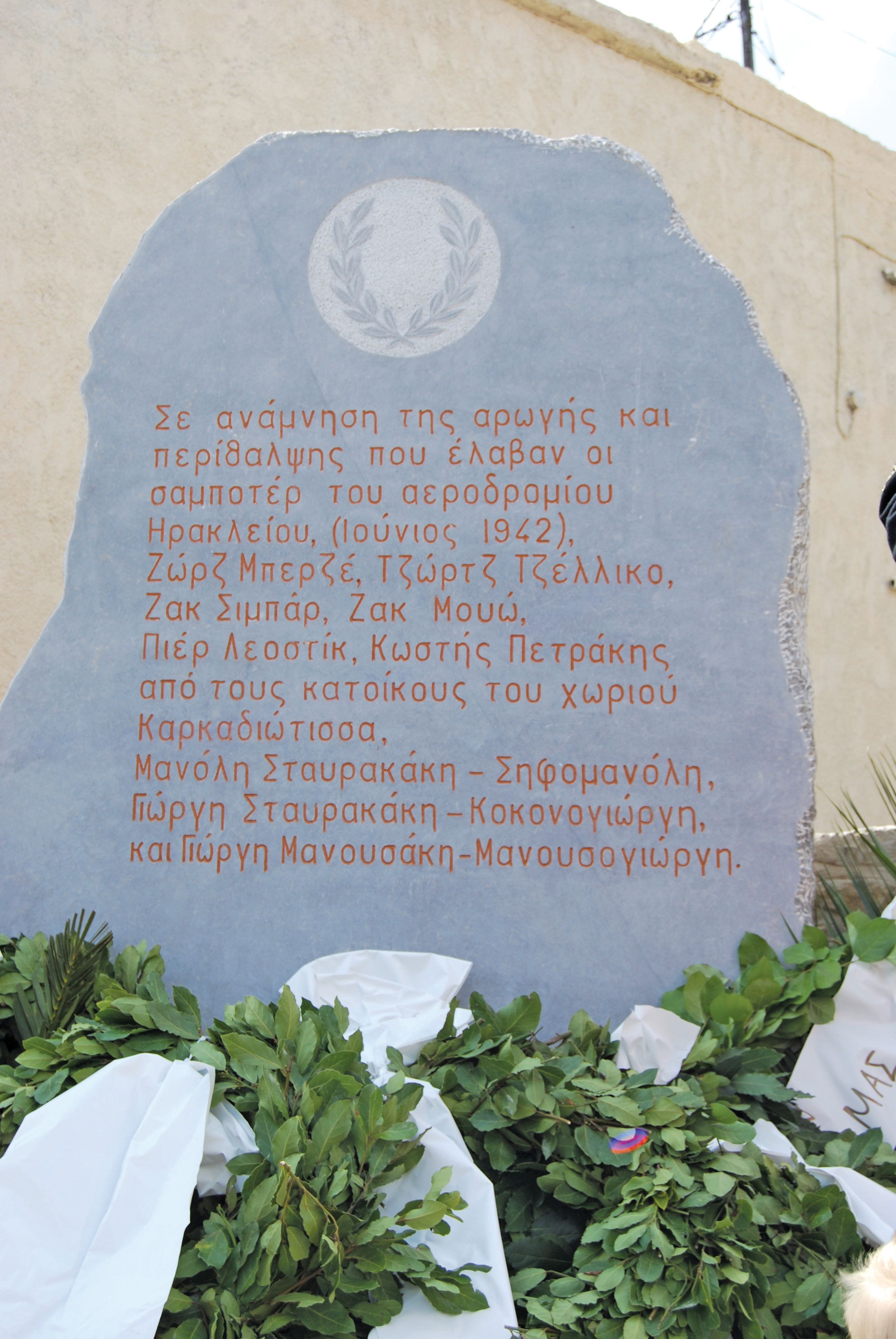 Μετά από 67 χρόνια, οι απόγονοι των παραπάνω πατριωτών αποφάσισαν και “έστησαν” στην Καρκαδιώτισσα μνημείο αφιερωμένο στους άντρες του σαμποτάζ του αεροδρομίου Ηρακλείου.