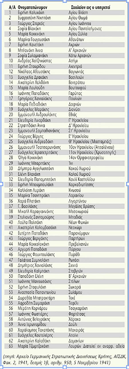 Ο Επιθεωρητής Ηρακλείου Κωνσταντίνος Σταυρινίδης, με έγγραφό του στις 5 Νοεμβρίου 1941 προς τον Γερμανό Φρούραρχο Ηρακλείου, καταγράφει τα σχολεία και τους Διευθυντές που είχε τοποθετήσει με το τέλος του Ελληνοϊταλικού πολέμου σ’αυτά. Συγκεκριμένα, στην αποσταλείσα κατάσταση του Κωνσταντίνου Σταυρινίδη προς τον Φρούραρχο, διαβάζουμε: