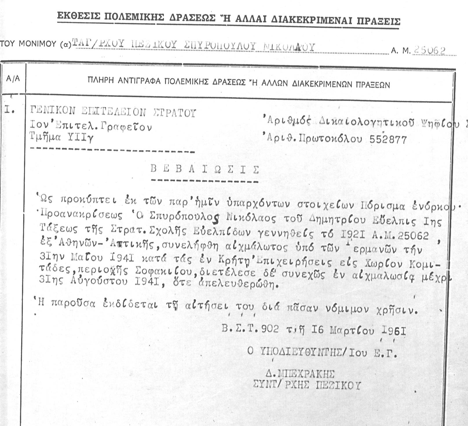 - 20-5-1941: Επίθεσις αλεξιπτωτιστών. Μάχη εναντίον αλεξιπτωτιστών. Ώρα 20.00 αναχώρησις δια Δελιανά.