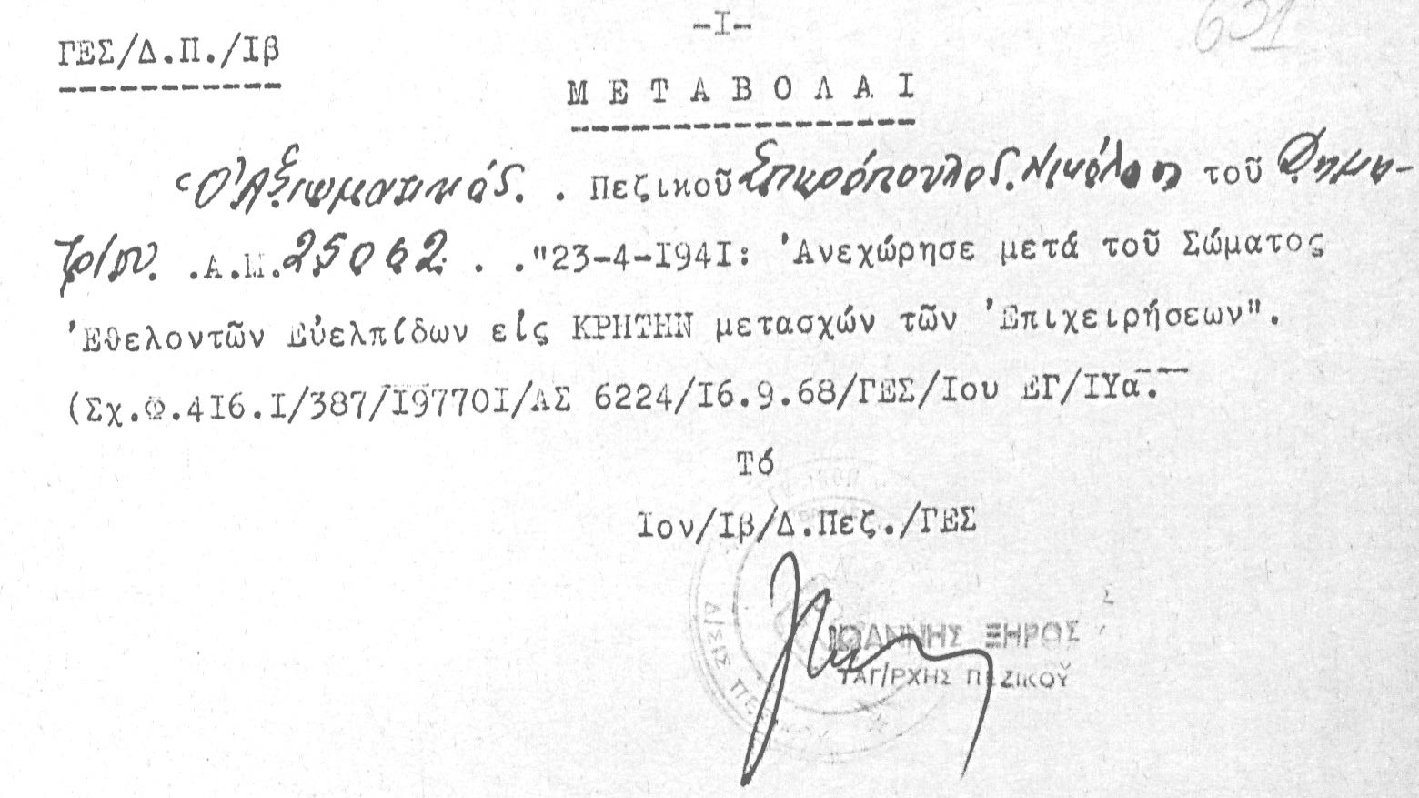 - «23-4-1941: Λήψις τελικής αποφάσεως δι’ αναχώρισιν εις Κρήτην. Επίταξις οχημάτων.