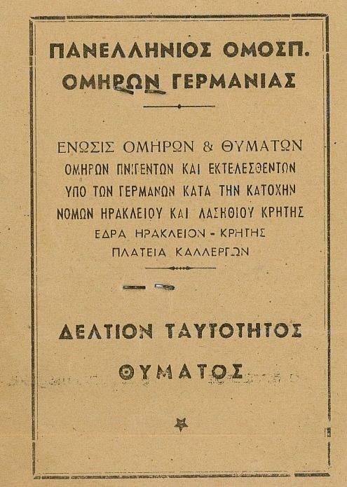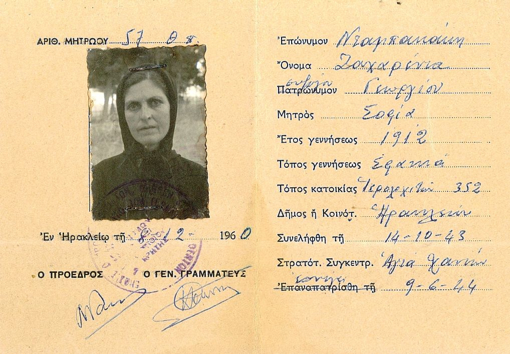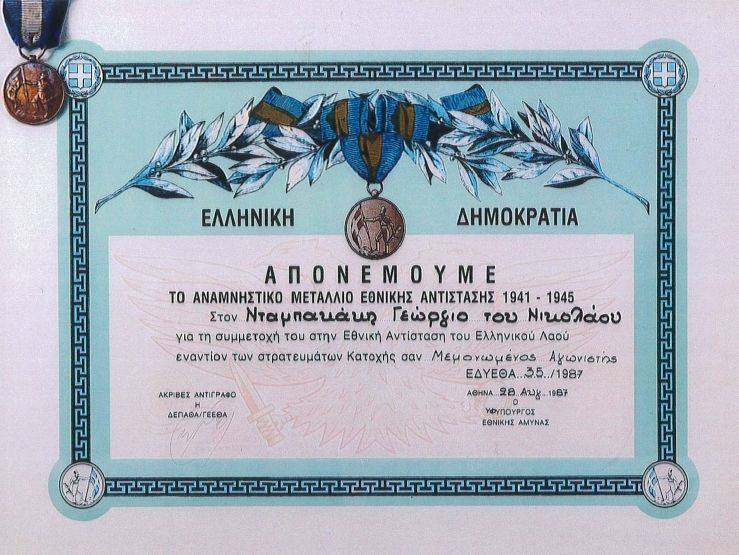 Επιτρέψατέ μου παρακαλώ να σας συναποστείλω πιστοποιητικά – δικαιολογητικά για τον φυλακισθέντα το έτος 1943 στις φυλακές της Αγιάς Χανίων, από τους κατακτητές μας Γερμανούς ΝΑΖΙ, αείμνηστο πατέρα μου ΝΤΑΜΠΑΚΑΗ ΓΕΩΡΓΙΟ του ΝΙΚΟΛΑΟΥ και της Άννας κάτοικο (τότε) της ΙΜΒΡΟΥ ΣΦΑΚΙΩΝ, προς ενημέρωσή σας.