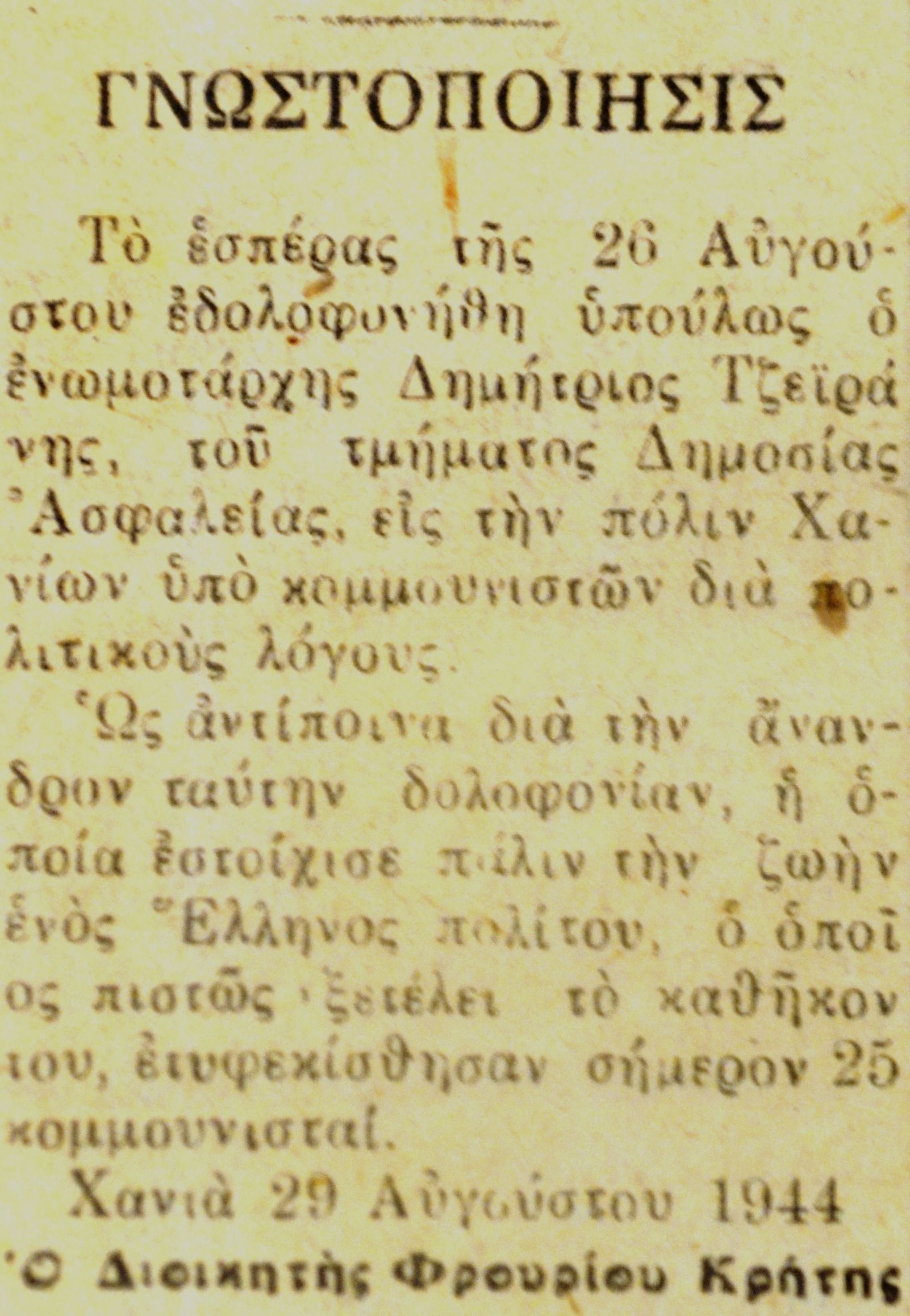 Το εσπέρας της 26ης Αυγούστου εδολοφονήθη υπούλως ο ενωμοτάρχης Δημήτριος Τζεϊράνης, του τμήματος Δημοσίας Ασφαλείας, εις την πόλιν Χανίων υπό κομμουνιστών δια πολιτικούς λόγους. Ως αντίποινα δια την άνανδρον ταύτην δολοφονίαν, η οποία εστοίχισε πάλιν την ζωήν ενός Έλληνος πολίτου, ο οποίος πιστώς εξετέλει το καθήκον του, ετυφεκίσθησαν σήμερον 25 κομμουνισταί.