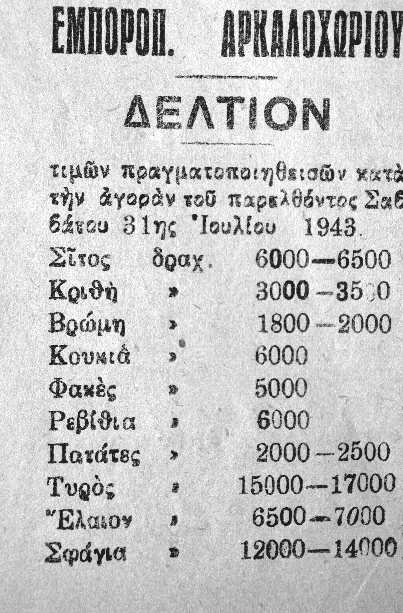Ανατρέχοντας στην εφημερίδα του Ηρακλείου Κρητικός Κήρυξ τους μήνες Ιούλιο ως Σεπτέμβριο του έτους 1943, συναντήσαμε οκτώ μικρά άρθρα με τίτλο: «ΕΜΠΟΡΟΠΑΝΗΓΥΡΙΣ ΑΡΚΑΛΟΧΩΡΙΟΥ – ΔΕΛΤΙΑ ΤΙΜΩΝ». Τα δελτία τιμών του παζαριού στο Αρκαλοχώρι, αναφέρονται στις τιμές των παρακάτω προϊόντων: Σιτάρι, κριθάρι, βρώμη, κουκιά, φακές, ρεβίθια, πατάτες, τυρί, λάδι και σφαγίων (κρεάτων). Μελετώντας τα παραπάνω δελτία τιμών για το καλοκαίρι του έτους1943, παρατηρούμε τα εξής: