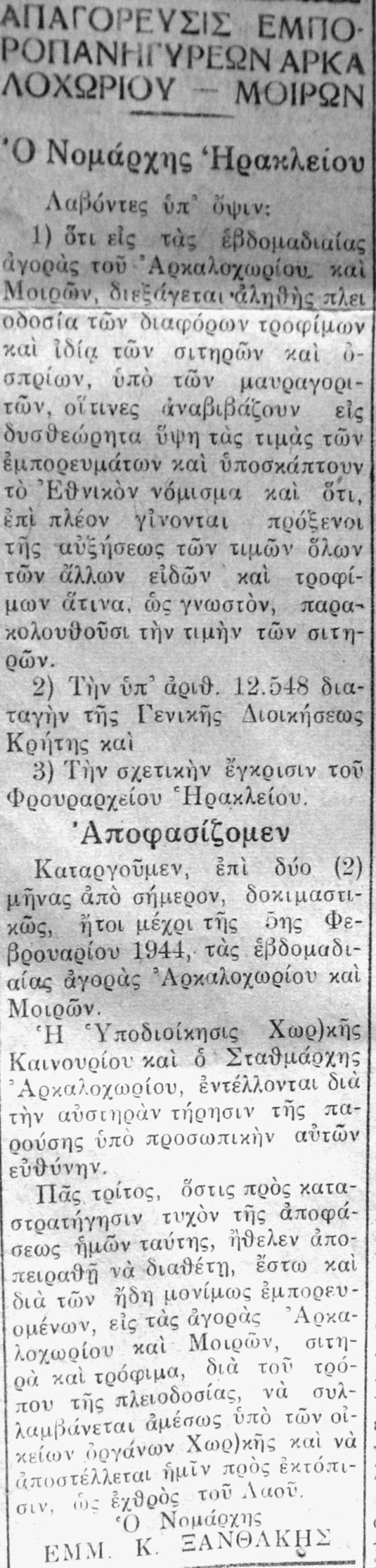 Καταργούμεν επί δύο (2) μήνας από σήμερον, δοκιμαστικώς, ήτοι μέχρι της 5ης Φεβρουαρίου 1944, τας εβδομαδιαίας αγοράς Αρκαλοχωρίου και Μοιρών. Η Υποδιοίκησις Χωροφυλακής Καινουρίου και ο Σταθμάρχης Αρκαλοχωρίου, εντέλλονται δια την αυστηράν τήρησιν της παρούσης υπό προσωπικήν αυτών ευθύνην. Πας τρίτος, όστις προς καταστρατήγησιν τυχόν της αποφάσεως ημών ταύτης, ήθελεν αποπειραθή να διαθέτη, έστω και δια των ήδη μονίμως εμπορευομένων, εις τας αγοράς Αρκαλοχωρίου και Μοιρών, σιτηρά και τρόφιμα, δια του τρόπου της πλειοδοσίας, να συλλαμβάνεται αμέσως υπό των οικείων οργάνων Χωροφυλακής και να αποστέλλεται ημίν προς εκτόπισιν, ως εχθρός του Λαού.