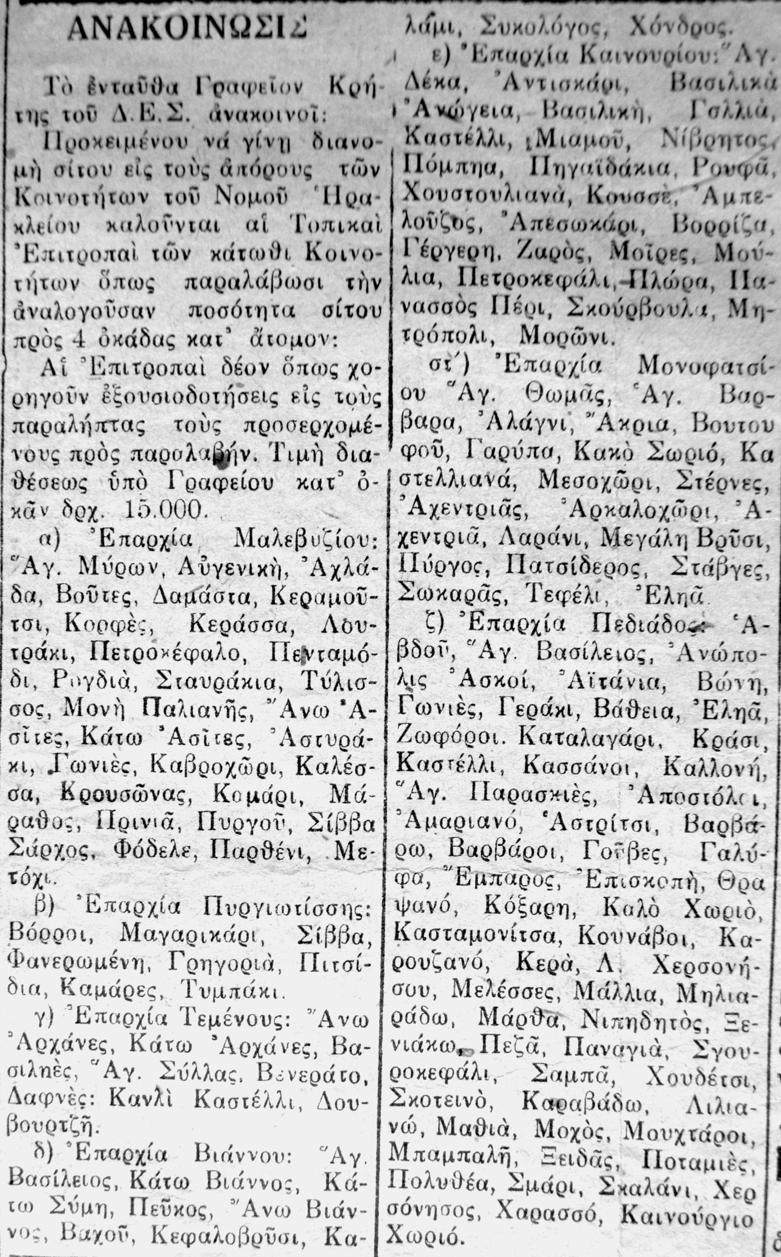 Το ενταύθα Γραφείον Κρήτης του Δ.Ε.Σ. ανακοινοί: Προκειμένου να γίνη διανομή σίτου εις τους απόρους των Κοινοτήτων του Νομού Ηρακλείου καλούνται αι Τοπικαί Επιτροπαί των κάτωθι Κοινοτήτων όπως παραλάβωσι την αναλογούσαν ποσότητα σίτου προς 4 οκάδας κατ’άτομον. Αι Επιτροπαί δέον όπως χορηγούν εξουσιοδοτήσεις εις τους παραλήπτας τους προσερχομένους προς παραλαβήν. Τιμή διαθέσεως υπό Γραφείου κατ’οκάν δρχ 15.000. (Σημ.: Το ποσόν των 15.000 δραχμών την οκά, αφορούσε το Γραφείο Κρήτης του Ερυθρού Σταυρού που αναλάμβανε συνολικά το κόστος της διάθεσης των σιτηρών στους απόρους).