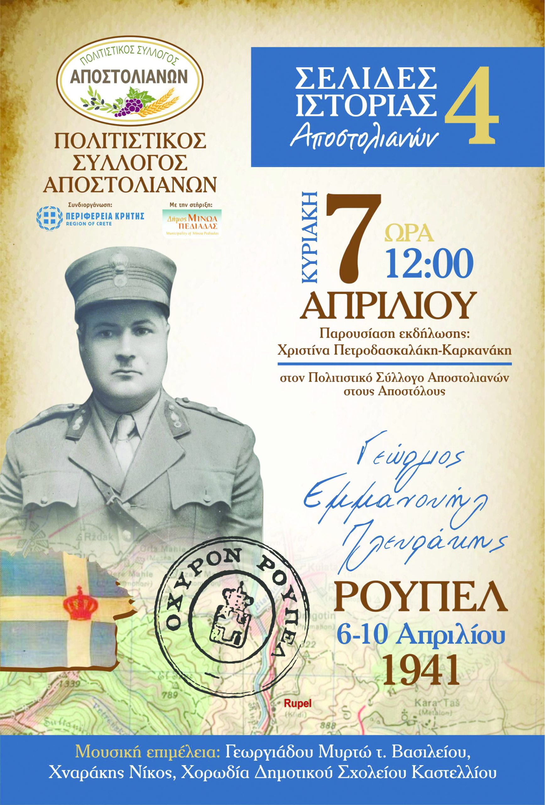 Σήμερα 83 χρόνια από την εισβολή της ναζιστικής Γερμανίας στη χώρα και την εποποιία των ηρώων στα οχυρά των βορείων συνόρων μας, πραγματοποιούμε με περηφάνια την 4η εκδήλωση με ιστορικό περιεχόμενο. Είναι αφιερωμένη στον συγχωριανό μας Γεώργιο Εμμ. Πλευράκη, Αντισυνταγματάρχη του Ελληνικού Στρατού, Διοικητή των οχυρών Ρούπελ.