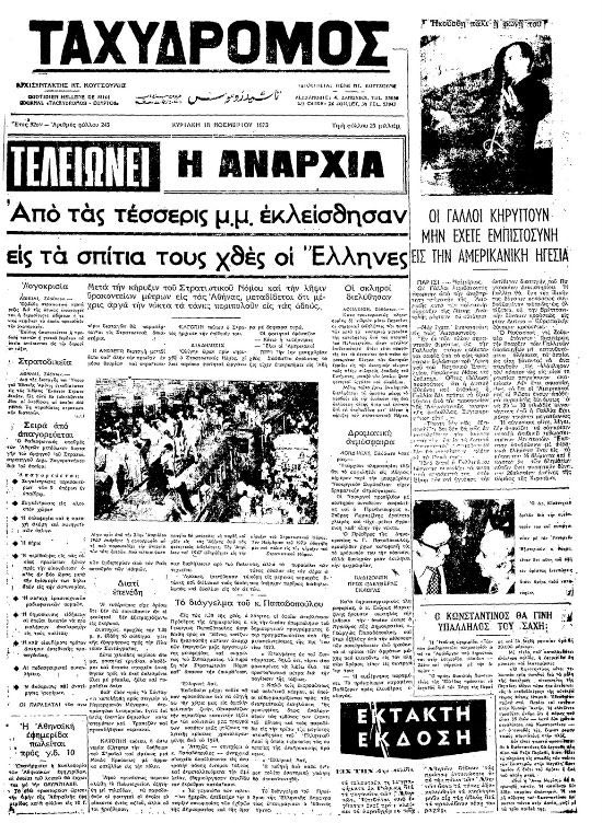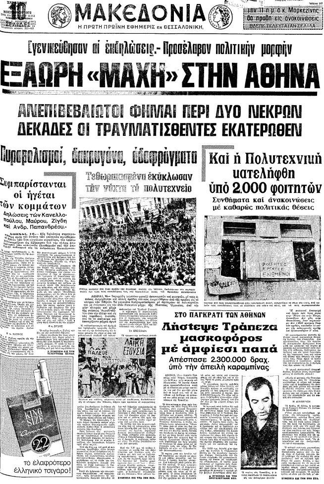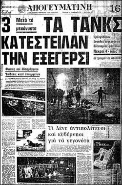 «Τα τανκς κατέστειλαν την εξέγερση» τιτλοφορείται η «Απογευματινή», ενώ ακολουθώντας πιο φιλοκυβερνητική στάση και τασσομένη κατά των φοιτητών ο «Ταχυδρόμος» έχει ως τίτλο: «Τας πρώτας αυγινάς ώρας σήμερον εις την Αθήνα, τα τανκς κατέστειλαν την φοιτητική αναρχία».