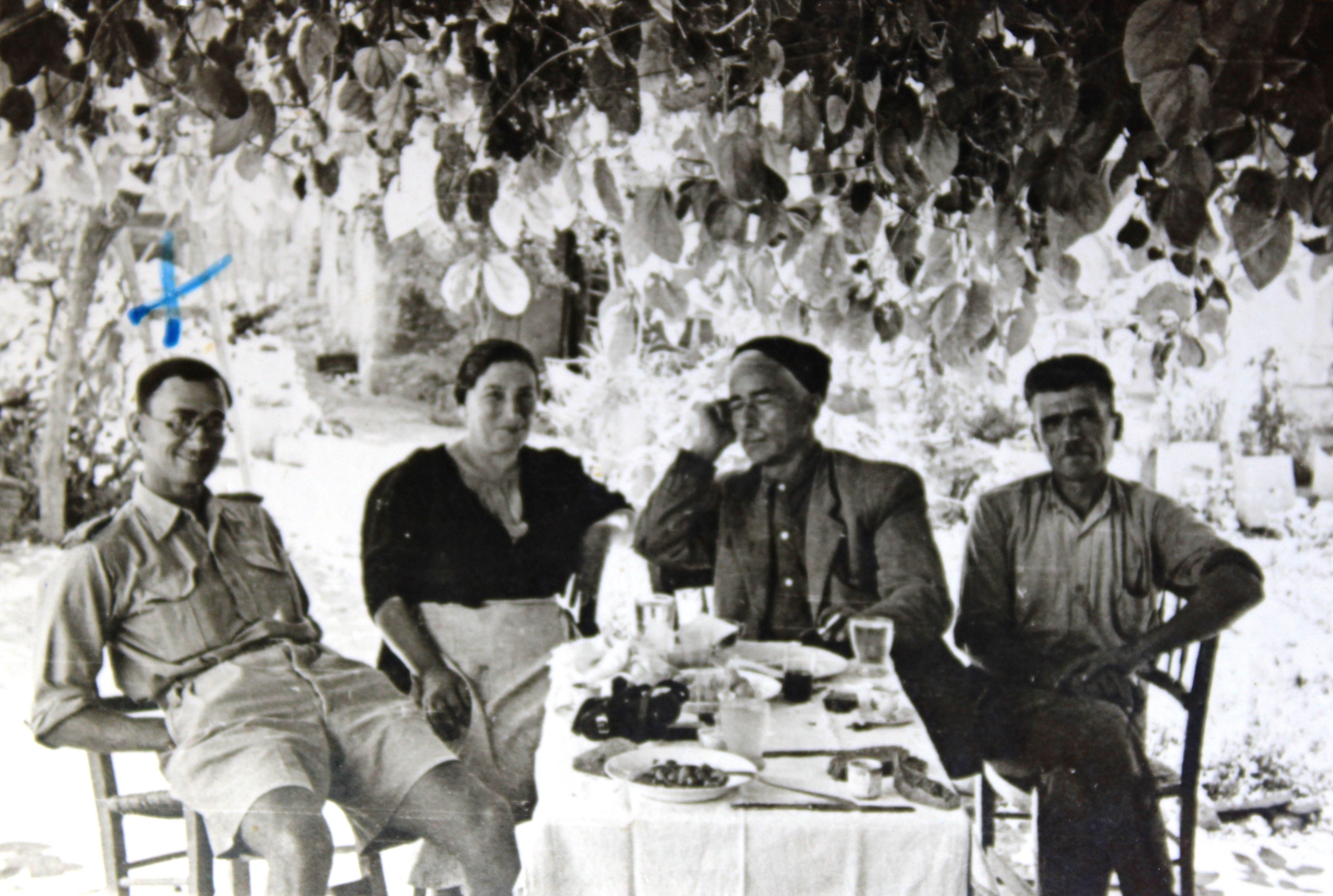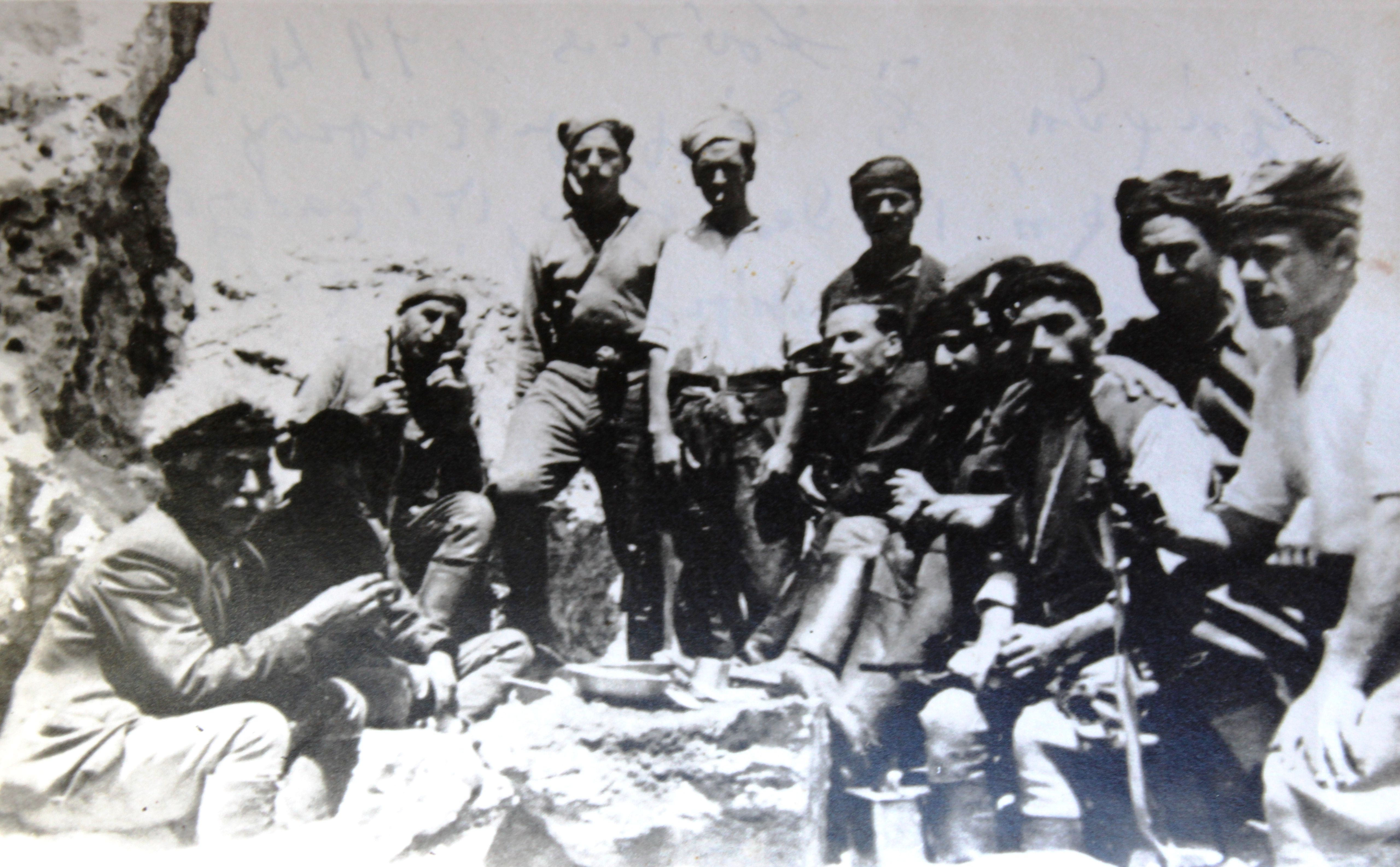 Στη φωτογραφία διακρίνεται και ο τρόπος που οι άντρες της Αντίστασης συνέτρωγαν στο βουνό, γύρω από το πέτρινο αυτοσχέδιο τραπέζι και από ένα μονάχα μεγάλο και βαθύ πιάτο. Στην άκρη δεξιά της φωτογραφίας ο αρχηγός της Α.Ο.Α. Χριστομιχάλης Ξυλούρης και δίπλα του ο Καπετάν Πετρακογιώργης. Στο κέντρο της φωτογραφίας και όρθιος με το μαύρο μαντήλι διακρίνεται ο Θανάσης Δραμουντάνης.