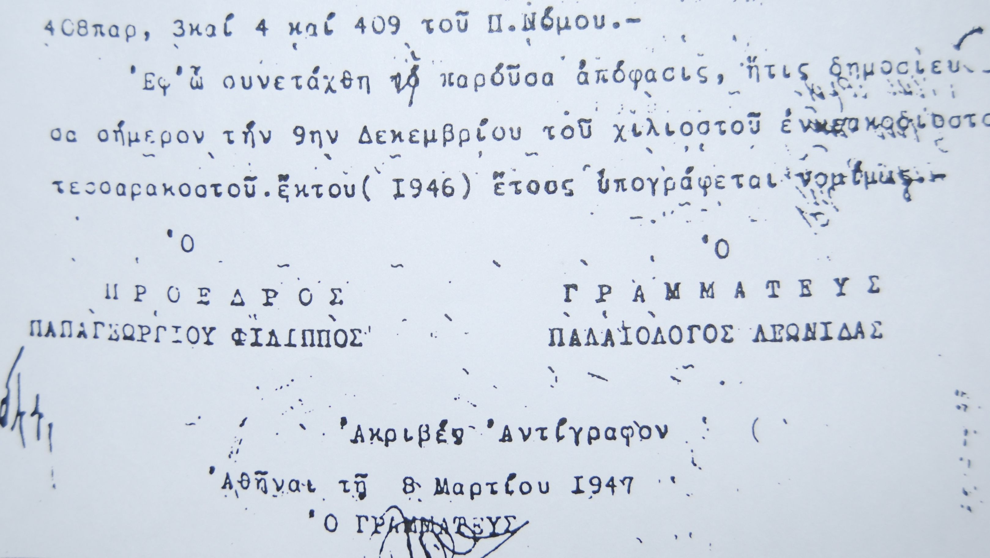 Εις το σημείον τούτο ο Πρόεδρος χάριν αναψυχής διέκοψε την συνεδρίασιν δια την 20ην Νοεμβρίου 1946, ημέραν Τετάρτη και ώραν 4 μ.μ. Την 20ην Νοεμβρίου 1946, ημέραν Τετάρτην και ώραν 4 μ μ. επανήλθεν το Δικαστήριον εις δημοσίαν αυτού συνεδρίασιν, παρόντων του τε Β. Ε. του Γραμματέως, των κατηγορουμένων και των συνηγόρων των. Μεθ’ό κατά διαταγήν του Προέδρου καλείται ο αυτός ως άνω μάρτυς Γεώργιος Πετρακογιώργης, όστις εν συνεχεία καταθέτει :