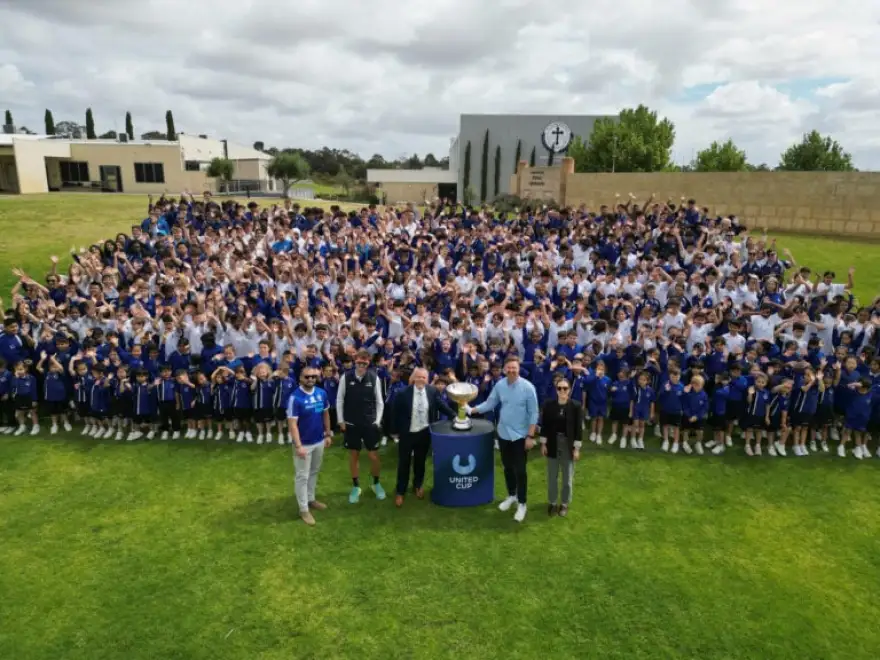 Οι μαθητές του μοναδικού ελληνορθόδοξου σχολείου στη Δυτική Αυστραλία, σχημάτισαν μια «ανθρώπινη ελληνική σημαία», με αφορμή την επίσκεψη του τροπαίου του United Cup στο σχολείο