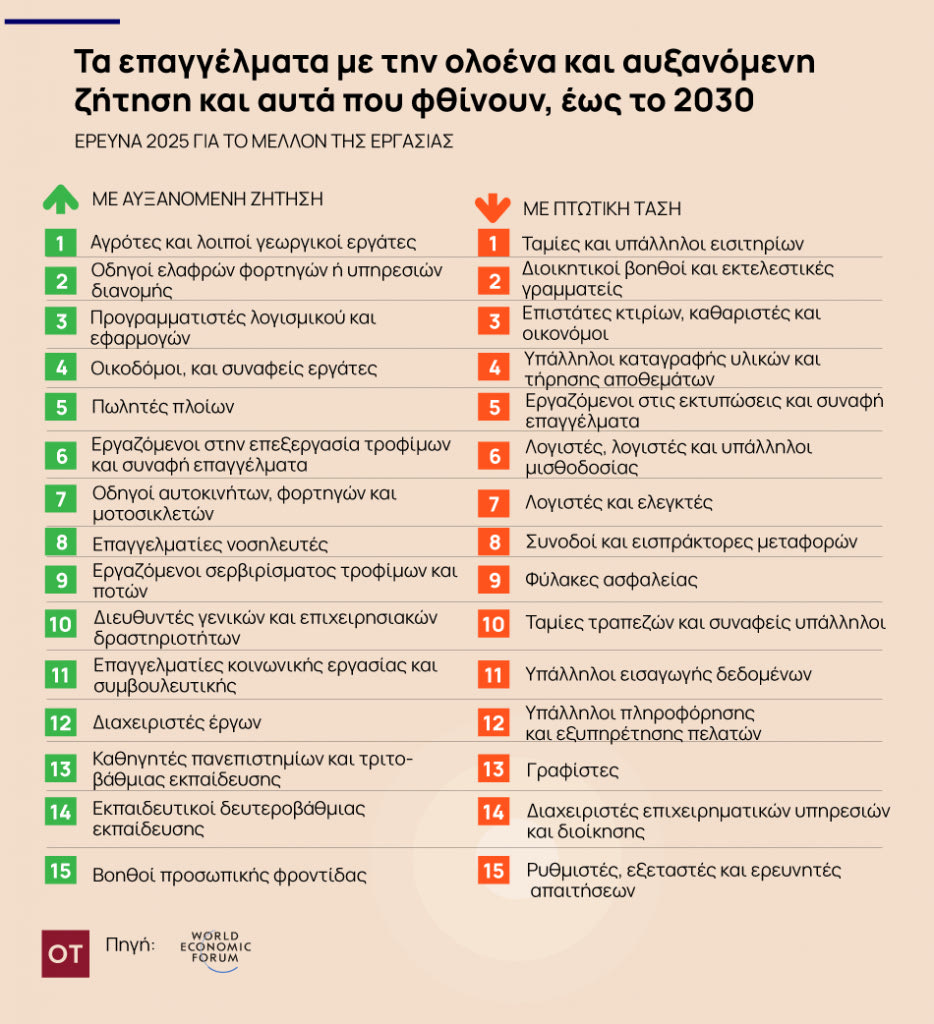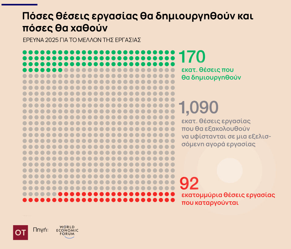 Αυτό διαπιστώνει η νέα έκθεση του World Economic Forum «Το μέλλον της εργασίας 2025», σύμφωνα με την οποία οι θέσεις εργασίας που δημιουργούνται ισοδυναμούν με το 14% της σημερινής απασχόλησης.