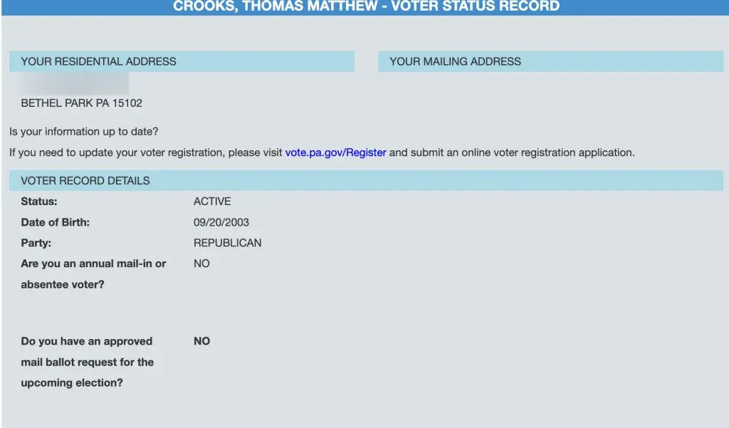 Σύμφωνα με αμερικανικές εφημερίδες που επικαλούνται τον εκλογικό κατάλογο της πολιτείας, ο δράστης της επίθεσης είναι εγγεγραμμένος ψηφοφόρος των Ρεπουμπλικανών.