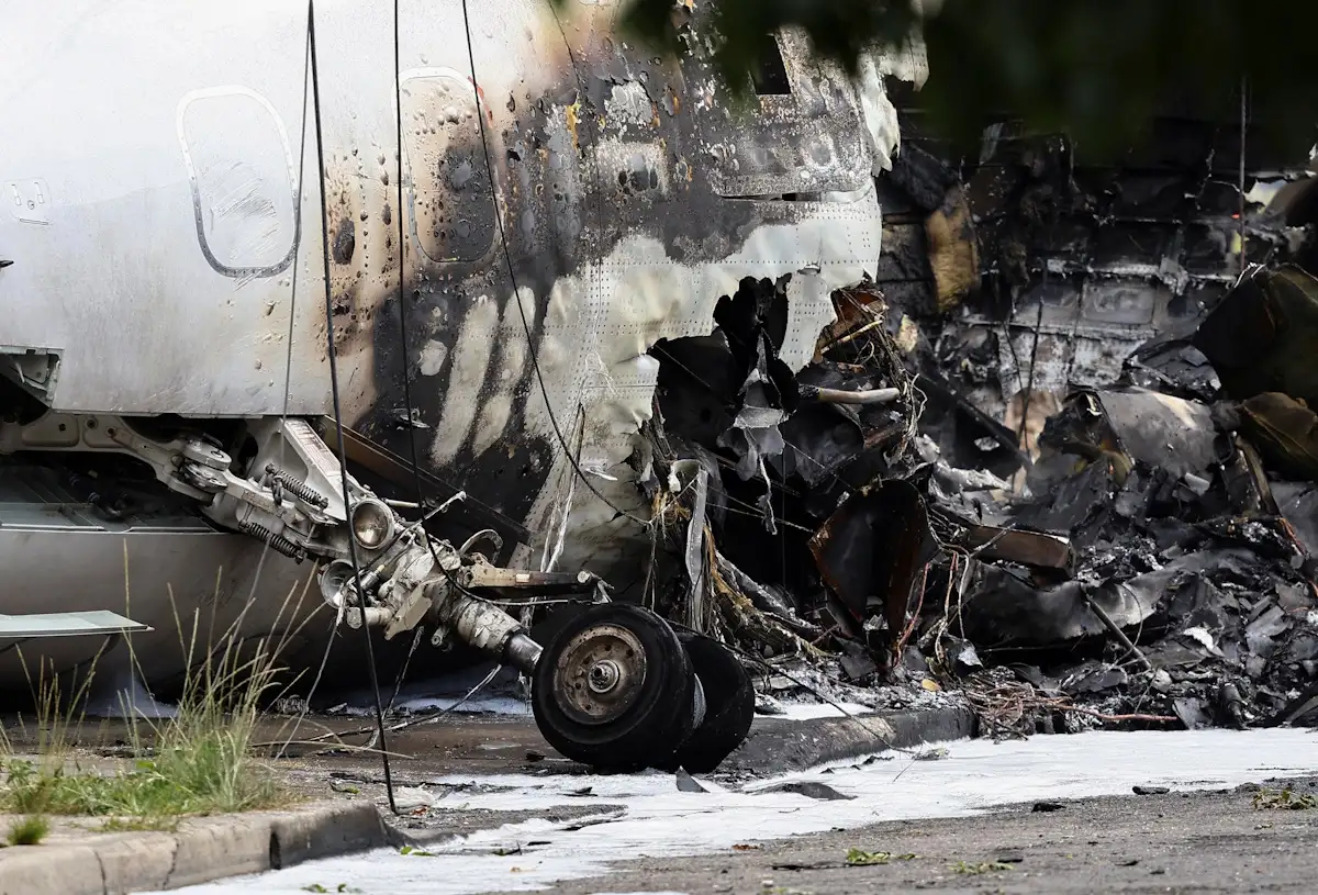 Βίντεο από κάμερα ασφαλείας δείχνει το τζετ να βγαίνει από τον διάδρομο προσαπογείωσης, να διαπερνά έναν φράκτη του αεροδρομίου και να πέφτει σε κτίριο στην απέναντι πλευρά του δρόμου.