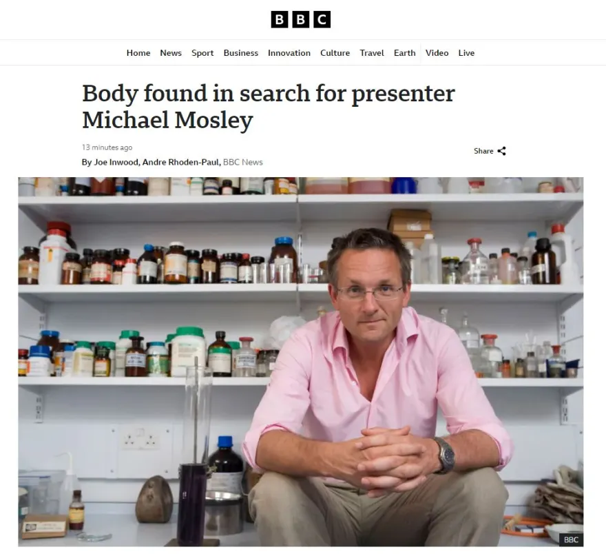 Την ώρα που έγινε γνωστή η είδηση ότι εντοπίστηκε η σορός του παρουσιαστή στη Σύμη το ΒΒC το μέσο στο οποίο εργαζόταν ο Δρ. Μάικλ Μόσλεϊ ανέφερε επικαλούμενο αστυνομική πηγή ότι ο άτυχος άνδρας ήταν νεκρός αρκετές μέρες.