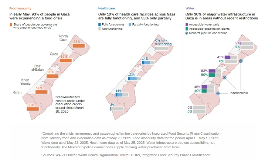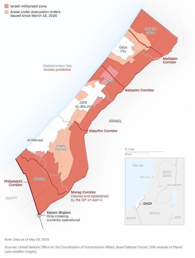 Η τελευταία στρατιωτική επιχείρηση του Ισραήλ, με την ονομασία «Άρματα του Γεδεών», έχει ως στόχο την «ολοκληρωτική κατάκτηση» της περιοχής, όπως την χαρακτήρισε ένας υπουργός της ισραηλινής κυβέρνησης. Σύμφωνα με τον ΟΗΕ, σχεδόν το 80% της περιοχής έχει λάβει εντολές εκκένωσης ή έχει χαρακτηριστεί ως στρατιωτικοποιημένη ζώνη από τις 18 Μαρτίου, όταν το Ισραήλ παραβίασε την εκεχειρία με τη Χαμάς. Από τότε, το Ισραήλ έχει αναγγείλει μια πολιτική – υποστηριζόμενη από τις ΗΠΑ – για την ενθάρρυνση της μετεγκατάστασης των κατοίκων της Γάζας.