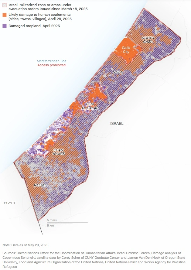 Από τότε που το Ισραήλ παραβίασε την εκεχειρία στα μέσα Μαρτίου, τουλάχιστον 2 – 3 χιλιόμετρα από τα χερσαία σύνορα της Γάζας έχουν μετατραπεί σε απαγορευμένη ζώνη, η οποία περιλαμβάνει μια ζώνη ασφαλείας πλάτους 1 χιλιομέτρου δίπλα στο ισραηλινό έδαφος, όπου σπίτια, εργοστάσια και αγροτικές εκτάσεις έχουν ισοπεδωθεί.