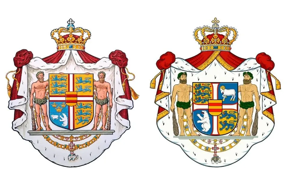 Ωστόσο, στην ανανεωμένη εκδοχή του εθνόσημου, τα στέμματα αφαιρέθηκαν και αντικαταστάθηκαν από μία πολική αρκούδα και ένα κριάρι, σύμβολα αντίστοιχα της Γροιλανδίας και τα Νησιά Φερόες.