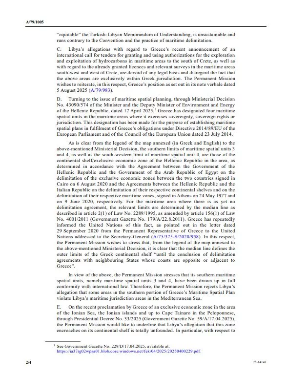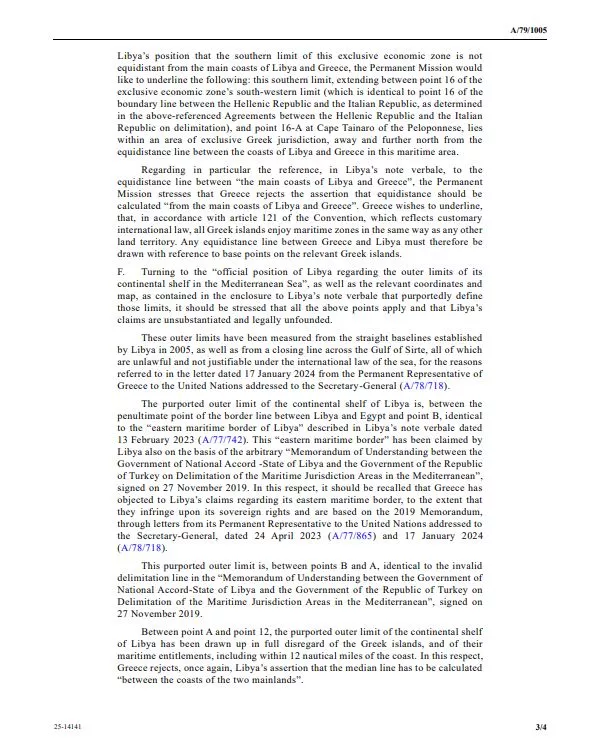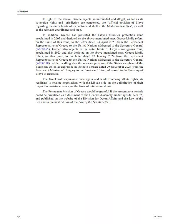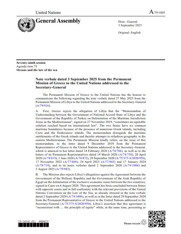 Αναρτήθηκε στον ΟΗΕ στις 12 Σεπτεμβρίου η ρηματική διακοίνωση της Αθήνας με την οποία απαντά στις διεκδικήσεις της Λιβύης.