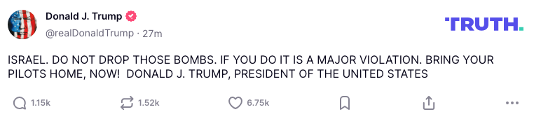 Με ανάρτησή του στην πλατφόρμα Truth Social, ο Αμερικανός πρόεδρος έγραψε με κεφαλαία γράμματα: «ΙΣΡΑΗΛ, ΜΗΜ ΡΙΞΕΤΕ ΑΥΤΕΣ ΤΙΣ ΒΟΜΒΕΣ. ΑΝ ΤΟ ΚΑΝΕΤΕ, ΕΙΝΑΙ ΣΟΒΑΡΗ ΠΑΡΑΒΙΑΣΗ. ΓΥΡΙΣΤΕ ΤΟΥΣ ΠΙΛΟΤΟΥΣ ΣΠΙΤΙ, ΤΩΡΑ!»