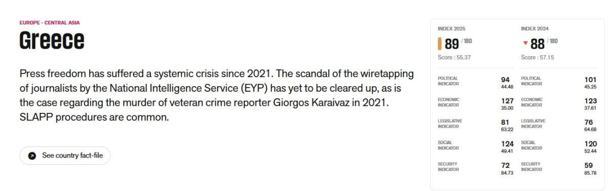Στην 89η θέση -και τελευταία μεταξύ των χωρών της Ευρωπαϊκής Ένωσης- βρίσκεται η Ελλάδα στην Ελευθερία του Τύπου, όπως την κατέταξε η έκθεση των Δημοσιογράφων Χωρίς Σύνορα (RSF).