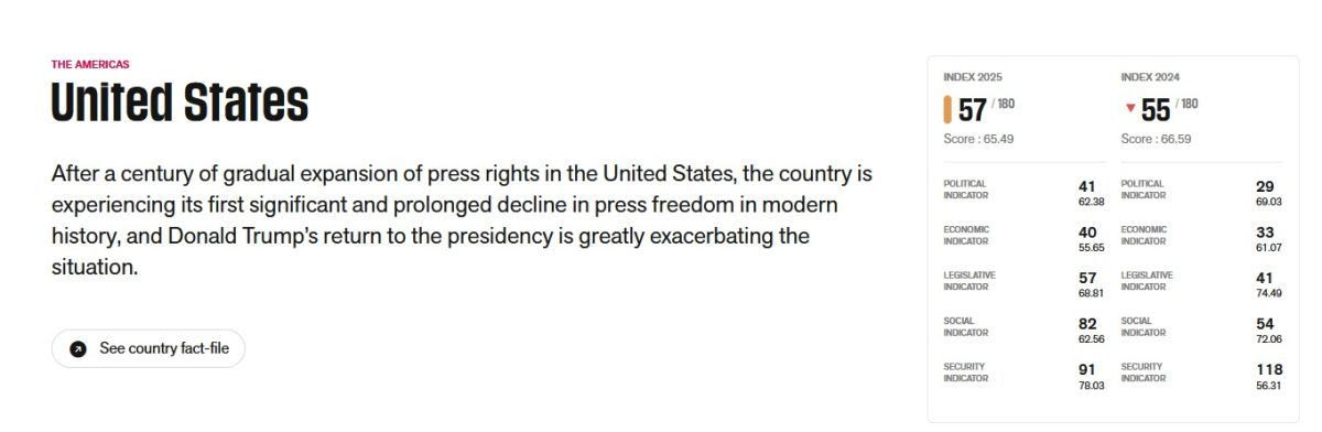 Οι δημοσιογράφοι στις ΗΠΑ λειτουργούν σε ένα ολοένα και πιο εχθρικό περιβάλλον, όπως φαίνεται από την πτώση, κατά 28 θέσεις, στον κοινωνικό δείκτη. Οι ΗΠΑ κατατάσσονται το 2025 στην 57η θέση της Ελευθερίας του Τύπου, δύο θέσεις χαμηλότερα σε σχέση με πέρσι.