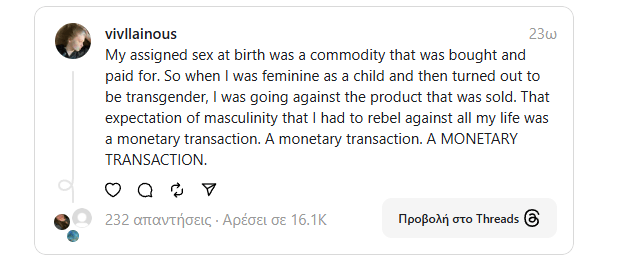 «Το φύλο που μου αποδόθηκε κατά τη γέννηση, ήταν ένα εμπόρευμα που αγοράστηκε και πληρώθηκε. Όταν αποκάλυψα πως είμαι τρανς, πήγα ενάντια στο προϊόν που πουλήθηκε. Αυτή η προσδοκία αρρενωπότητας, ενάντια στην οποία έπρεπε να επαναστατήσω σε όλη μου τη ζωή, ήταν μια χρηματική συναλλαγή. Μια χρηματική συναλλαγή. ΜΙΑ ΝΟΜΙΣΜΑΤΙΚΉ ΣΥΝΑΛΛΑΓΉ», έγραψε χαρακτηριστικά σε ανάρτησή της στην πλατφόρμα Threads.