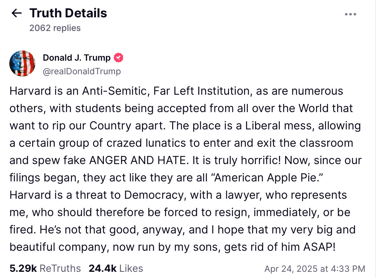 Σε μήνυμα στην πλατφόρμα του κοινωνικής δικτύωσης «Truth Social», ο Ντόναλντ Τραμπ έγραψε για το Χάρβαρντ: «Αυτό το μέρος είναι ένα προοδευτικό χάλι» και «δέχεται φοιτητές από ολόκληρο τον κόσμο που θέλουν να καταστρέψουν τη χώρα μας».