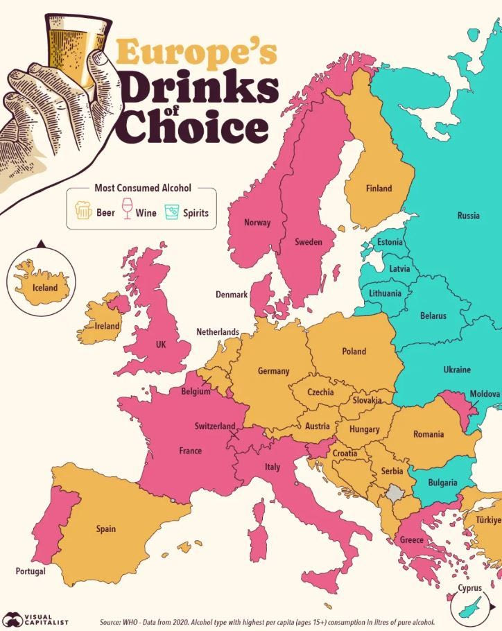 Όπως είναι φυσικό, ανά περιοχή οι προτιμήσεις για το αλκοόλ διαφέρουν σημαντικά. Ένας χάρτης απεικονίζει το πιο δημοφιλές είδος αλκοόλ σε διάφορες ευρωπαϊκές χώρες, με βάση την κατά κεφαλήν κατανάλωση (σε λίτρα καθαρού αλκοόλ) μεταξύ ατόμων ηλικίας 15 ετών και άνω.