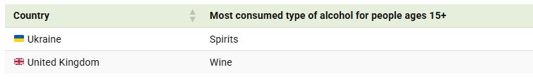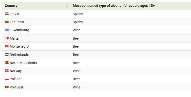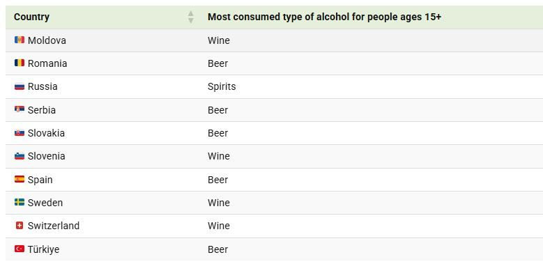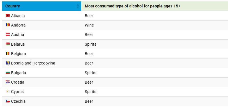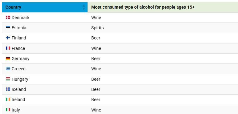 Όπως είναι φυσικό, ανά περιοχή οι προτιμήσεις για το αλκοόλ διαφέρουν σημαντικά. Ένας χάρτης απεικονίζει το πιο δημοφιλές είδος αλκοόλ σε διάφορες ευρωπαϊκές χώρες, με βάση την κατά κεφαλήν κατανάλωση (σε λίτρα καθαρού αλκοόλ) μεταξύ ατόμων ηλικίας 15 ετών και άνω.
