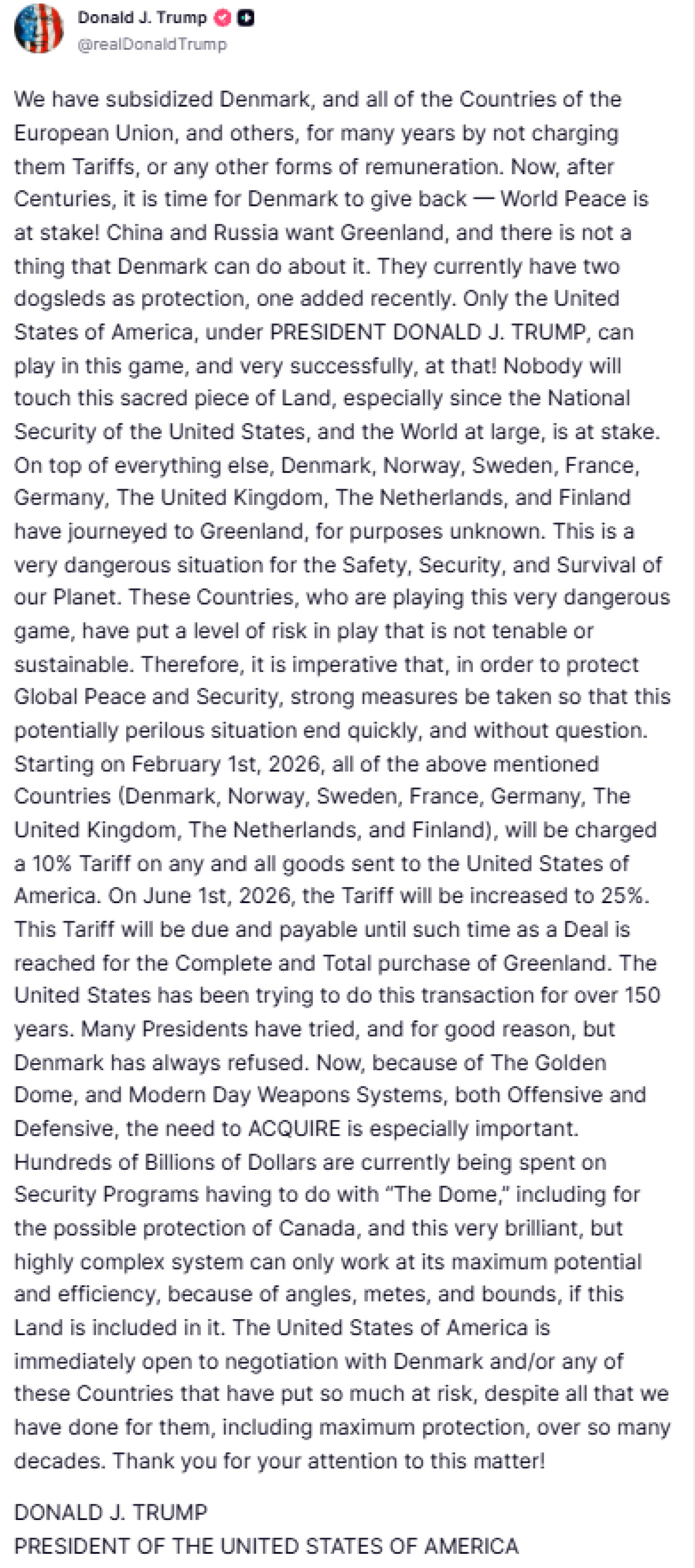 «Εδώ και πολλά χρόνια, επιδοτούμε τη Δανία, όλες τις χώρες της Ευρωπαϊκής Ένωσης και άλλες χώρες, χωρίς να τους επιβάλλουμε δασμούς ή άλλες μορφές αποζημίωσης. Τώρα, μετά από αιώνες, ήρθε η ώρα η Δανία να ανταποδώσει — διακυβεύεται η παγκόσμια ειρήνη!