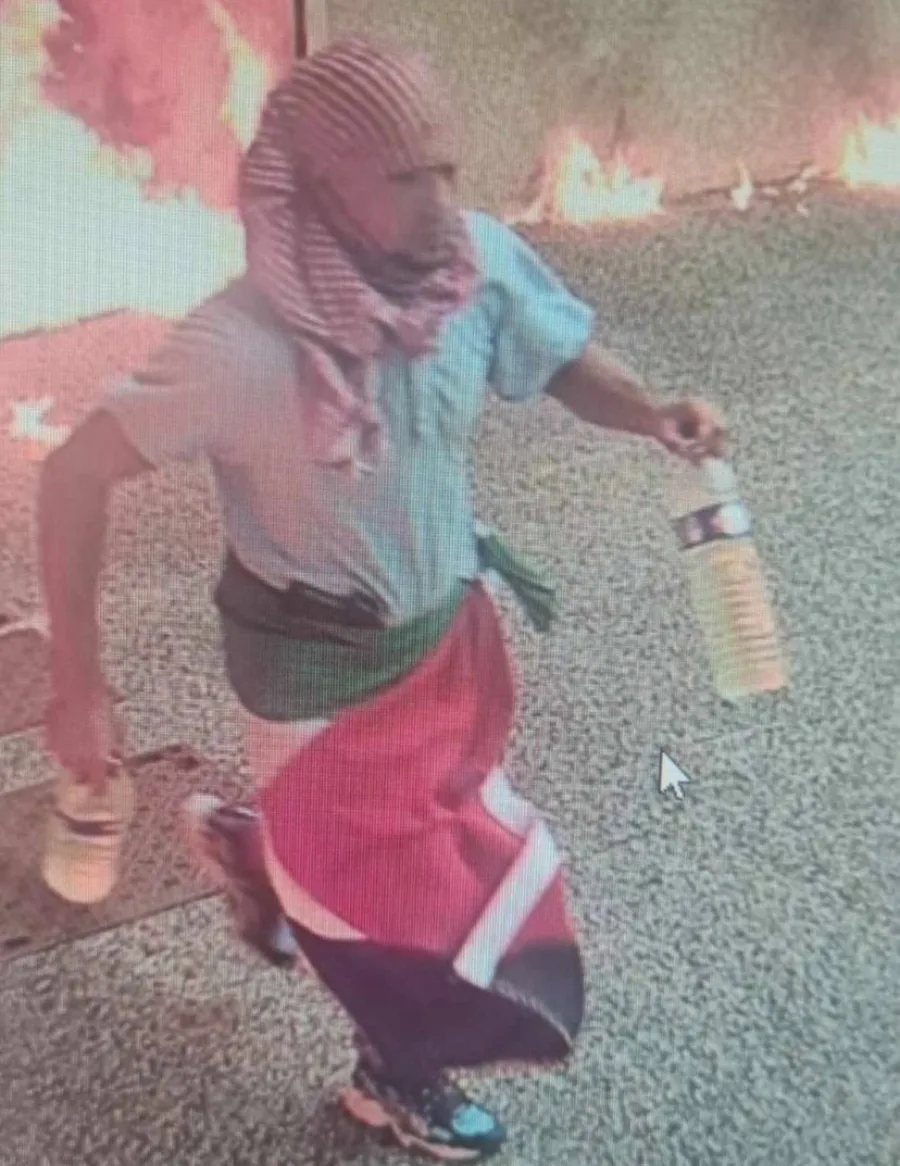 Στη φωτογραφία εμφανίζεται ένας άνδρας, με την παλαιστινιακή σημαία γύρω από τη μέση του και την παραδοσιακή παλαιστινιακή μαντήλα στο κεφάλι του να κρατάει δύο άδεια πλαστικά μπουκάλια και να φεύγει από τον τόπο του εγκλήματος με τα πόδια.