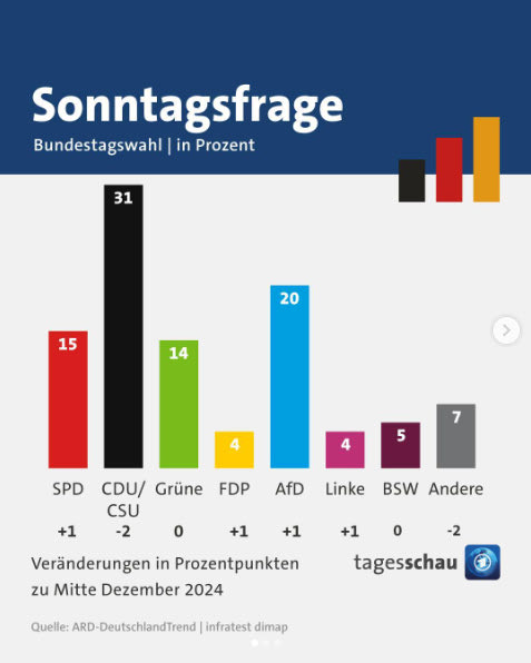 Οι κεντροδεξιοί συντηρητικοί του CDU/CSU προηγούνται σταθερά σε όλες τις δημοσκοπήσεις. Στην πιο πρόσφατη δημοσκόπηση του πρώτου κρατικού δικτύου ARD, οι Χριστιανοδημοκράτες/Χριστιανοκοινωνιστές συγκεντρώνουν το 31%. Δεύτερη πολιτική δύναμη συνεχίζει επίσης σταθερά να καταγράφεται το ακροδεξιό Alternative fuer Deutschland (AfD), οι νέοι καλύτεροι φίλοι του μεγιστάνα Έλον Μασκ, λαμβάνοντας στη συγκεκριμένη δημοσκόπηση το 20% της πρόθεσης ψήφου.
