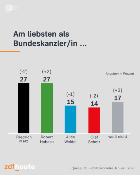 Μια ενδιαφέρουσα, ωστόσο, τάση που ενισχύεται το τελευταίο διάστημα αφορά τη δημοφιλία του υποψηφίου καγκελαρίου για το κόμμα των Πρασίνων, του μέχρι τώρα Υπουργού Οικονομίας, Ρόμπερτ Χάμπεκ. Σε δημοσκόπηση για λογαριασμό του ZDF, του δεύτερου κρατικού δικτύου της γερμανικής τηλεόρασης, ο Χάμπεκ ισοβαθμεί στην καταλληλότητα για την πρωθυπουργία με τον επικεφαλής των Χριστιανοδημοκρατών Φρίντριχ Μερτς, με τον δεύτερο όμως να πέφτει και τον υποψήφιο των Πρασίνων να εμφανίζει ισχυρή ανοδική τάση.