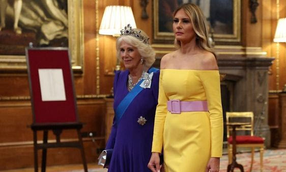 Λίγο οι έξω ώμοι και λίγο η ζώνη που επέλεξε η ομάδα της Μελάνια Τραμπ προκάλεσαν αντιδράσεις για το αν τελικά έπρεπε η Πρώτη Κυρία των ΗΠΑ να εμφανιστεί δίπλα στον Βασιλιά Κάρολο και δίπλα στη Βασίλισσα Καμίλα έτσι.