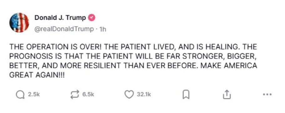 Το πρώτο μήνυμά του μετά την ανακοίνωση των νέων δασμών έστειλε με ανάρτησή του ο Αμερικανός πρόεδρος, Ντόναλντ Τραμπ. «Η εγχείρηση τελείωσε. Ο ασθενής επέζησε και αναρρώνει» έγραψε χαρακτηριστικά ο Τραμπ στο Truth Social.