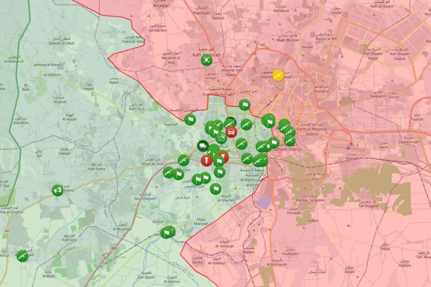 Χάρτης που δείχνει το μέτωπο στην πόλη του Χαλεπίου. Με πράσινο οι δυνάμεις των τζιχανιστών στα δυτικά της πόλης (στην αριστερή πλευρά της εικόνας) και με κόκκινο οι δυνάμεις του Άσαντ