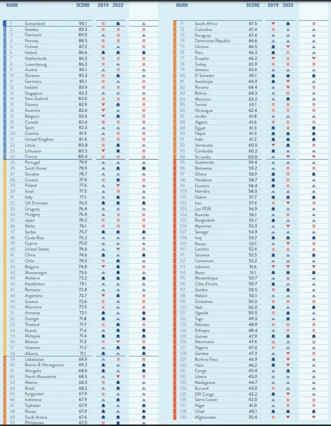 Ειδικότερα, η Ελλάδα εμφανίζεται να μην έχει κάνει καμία πρόοδο (στάσιμη) την περίοδο 2015-2019 αλλά «μερική» πρόοδο το διάστημα 2019-2022 ενώ οι προβλέψεις την θέλουν να επιστρέφει στη στασιμότητα την περίοδο από τώρα έως το 2030.
